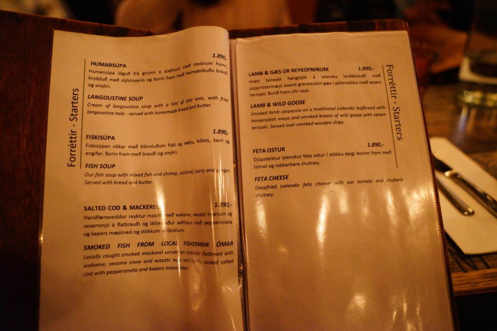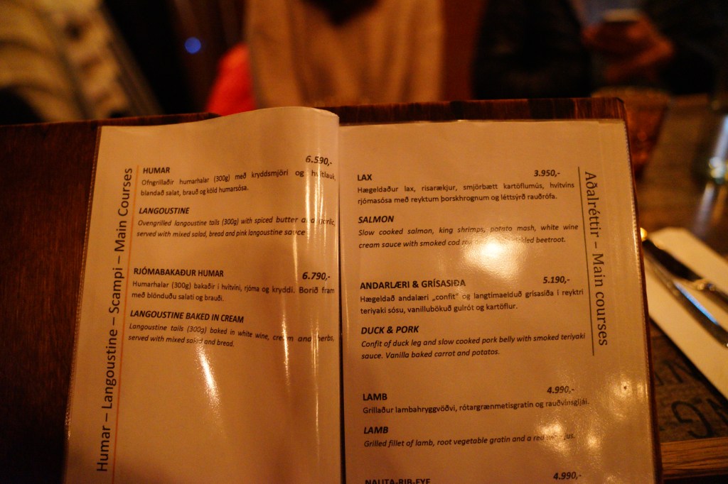 價格從1,890ISK到6,790ISK都有,比起之前推薦的Sudur vik貴了一些。餐廳裡面很有氣氛,燈光昏暗,桌上有著蠟燭和花。
