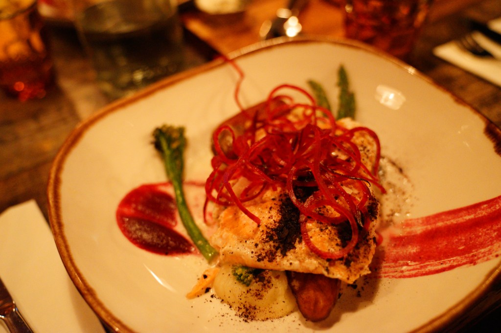 等了一段時間餐點終於上來了!!!上面這個應該是魚排,看起來非常的厲害,但實際上…….很鹹……..尤其越底下越鹹,旁邊的醬料雖然吃不出來是什麼醬,但不得不說冰島餐廳調製的醬料都蠻厲害的。