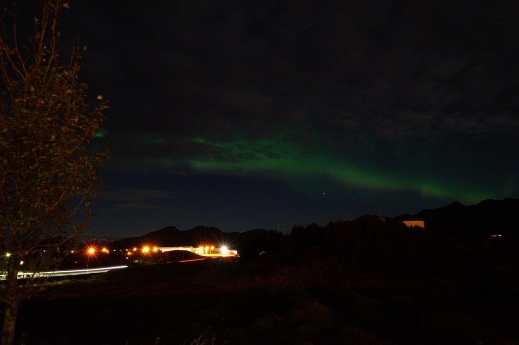 這家餐廳位置在Hofn的港口,因為抵達的時間天已經黑了,而且大家都累了一整天,外頭風又很大,習慣性地看了一下天空,總覺得有點綠綠的感覺,但因為港口光害其實蠻嚴重的,所以大家也不以為意地進去餐廳。