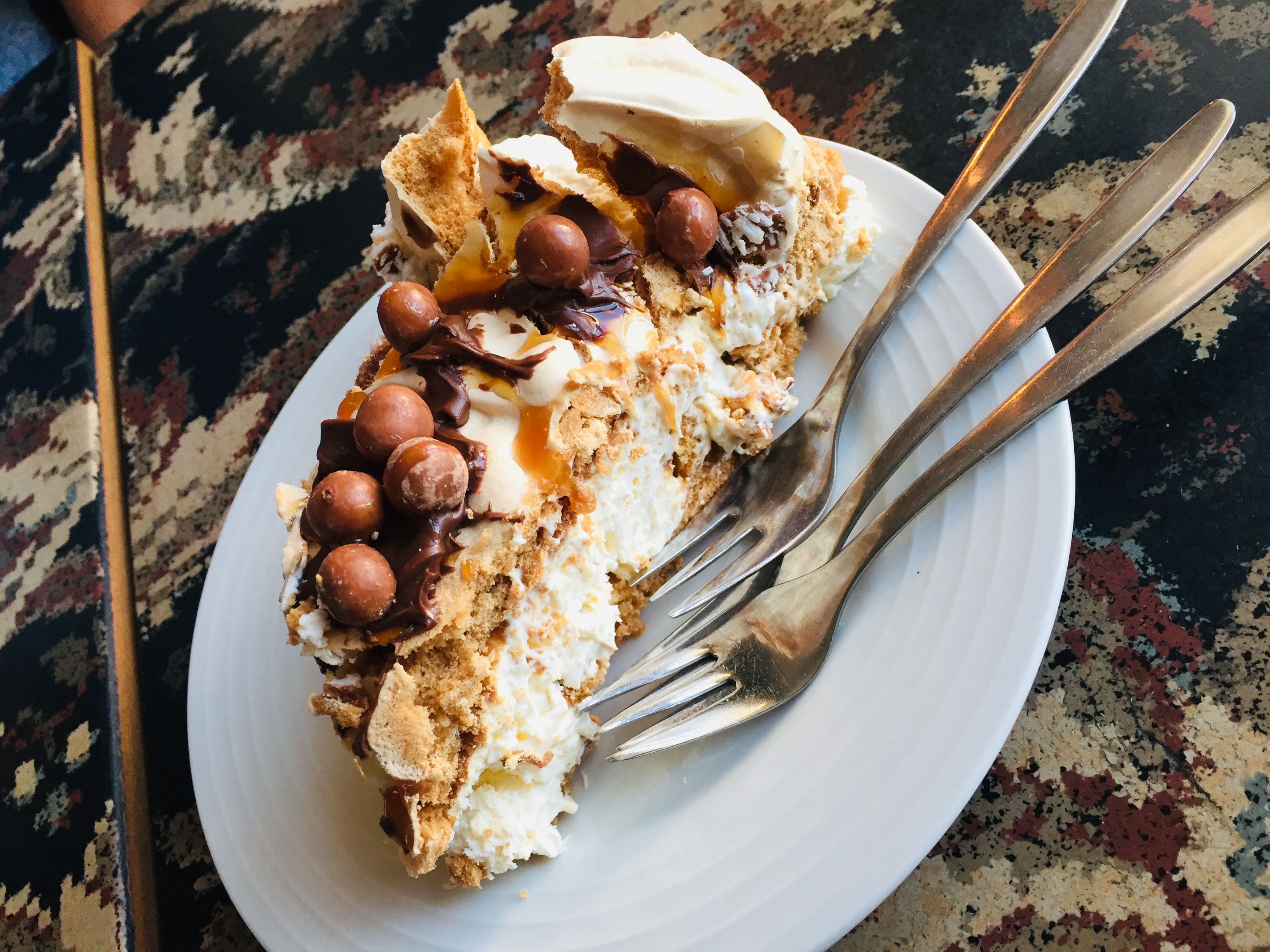 因為在冰島都沒有吃到甜點,早上看到櫥窗裡有蛋糕,同伴們就點了一塊大家一起吃。上面是巧克力豆,中間是戚風基底,外面裹了很厚的一層鮮奶油,我完全不是螞蟻人的人都可以吃掉半塊,看起來很甜但吃起來一點都不會,鮮奶油超級好吃,而且上面應該還有放威化餅乾,整體吃起來很有層次,很好吃。