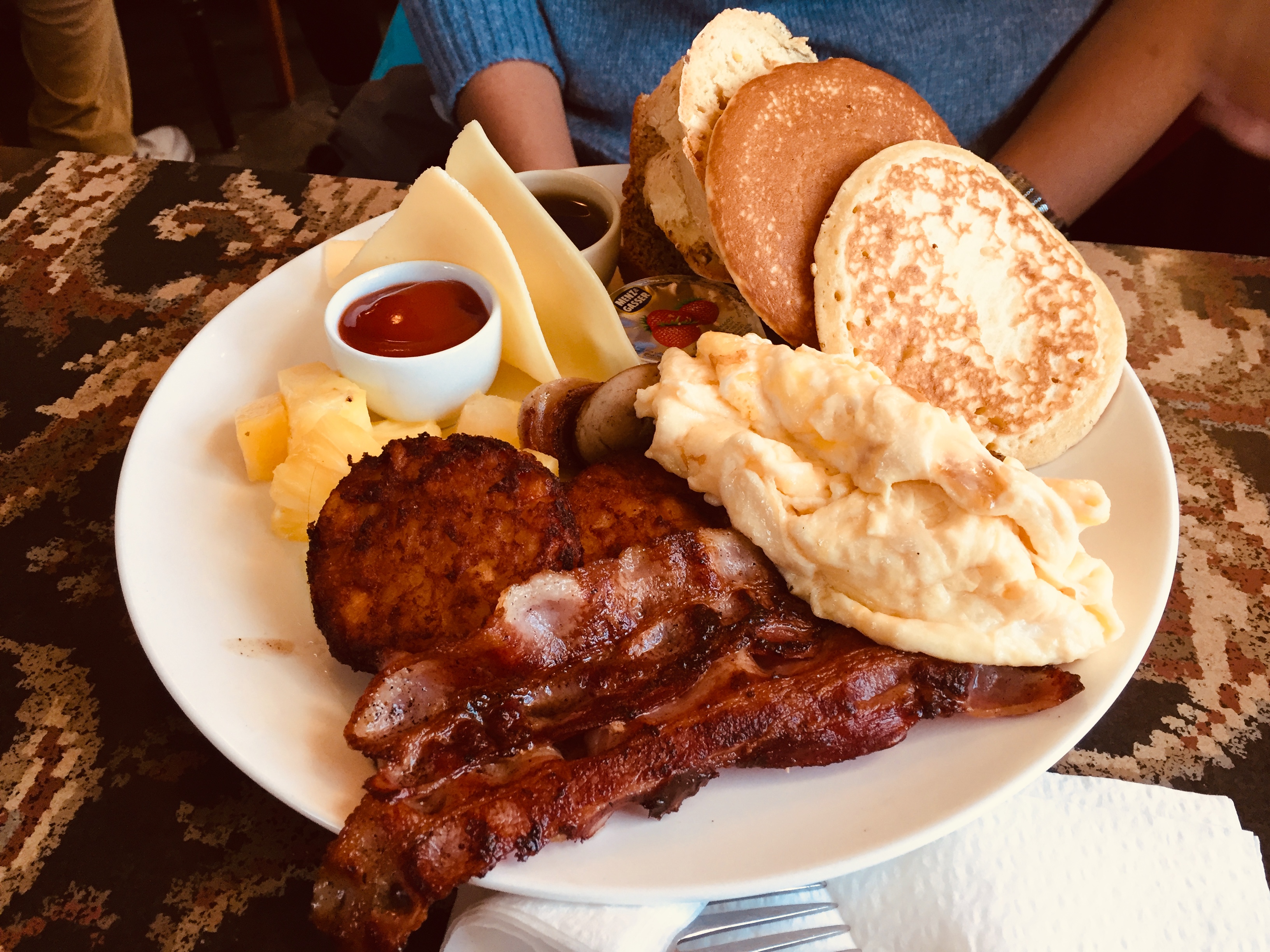 我們一人點了一組食物,每一盤份量都很大,上面這個是鬆餅+薯餅+起司+蛋+培根+香腸,非常豐盛,這家餐廳的培根和薯餅算蠻鹹的,但是培根煎得非常脆,咬起來會有咖ㄘ咖ㄘ的聲音,我愛這種培根,因此鹹一點也能接受😁