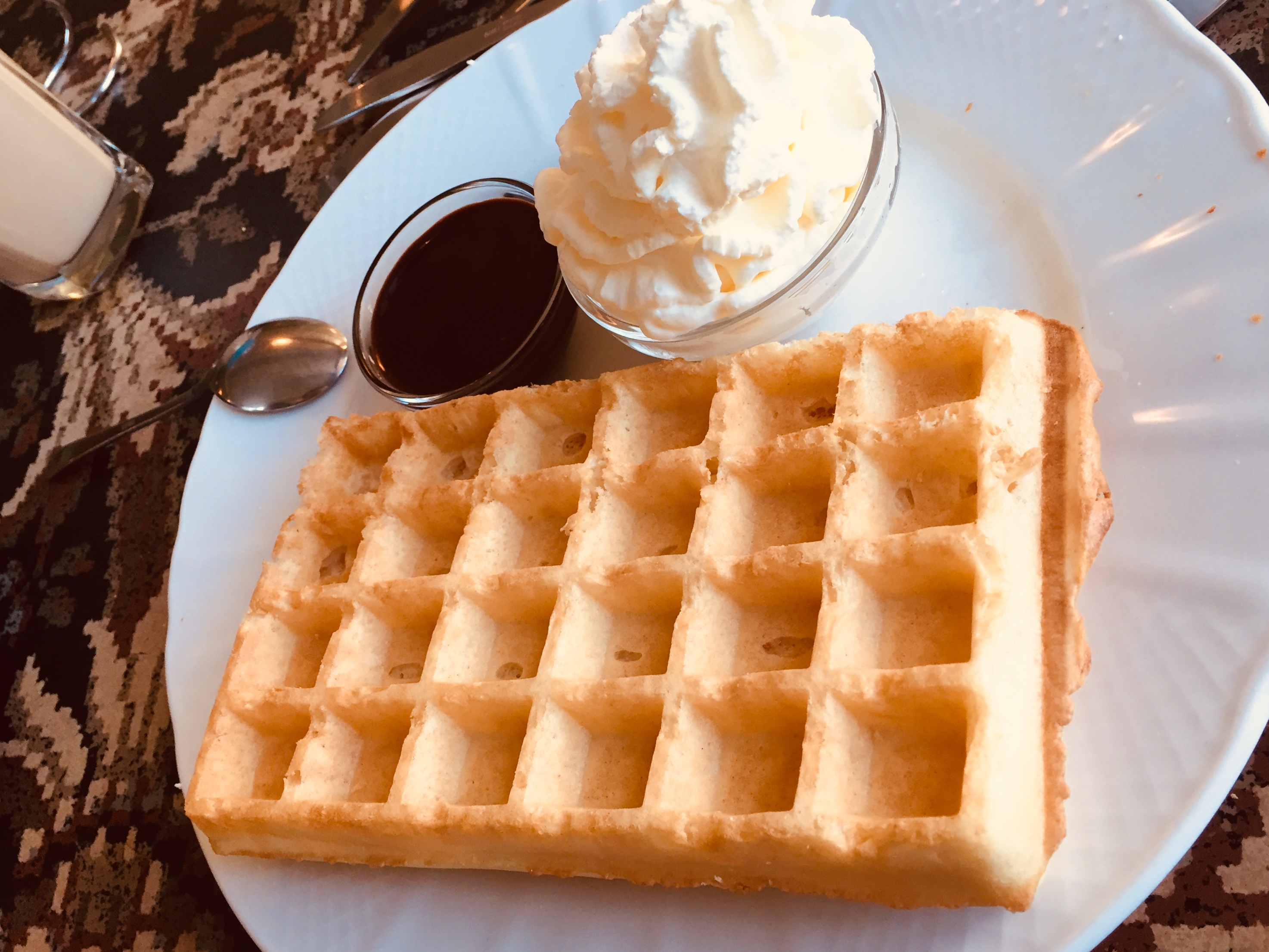 還有誇張大的鬆餅,但因為是點楓糖鬆餅,吃起來有點空虛…不過鬆餅咬起來是有奶香味的,鮮奶油甜而不膩,整體也算好吃。