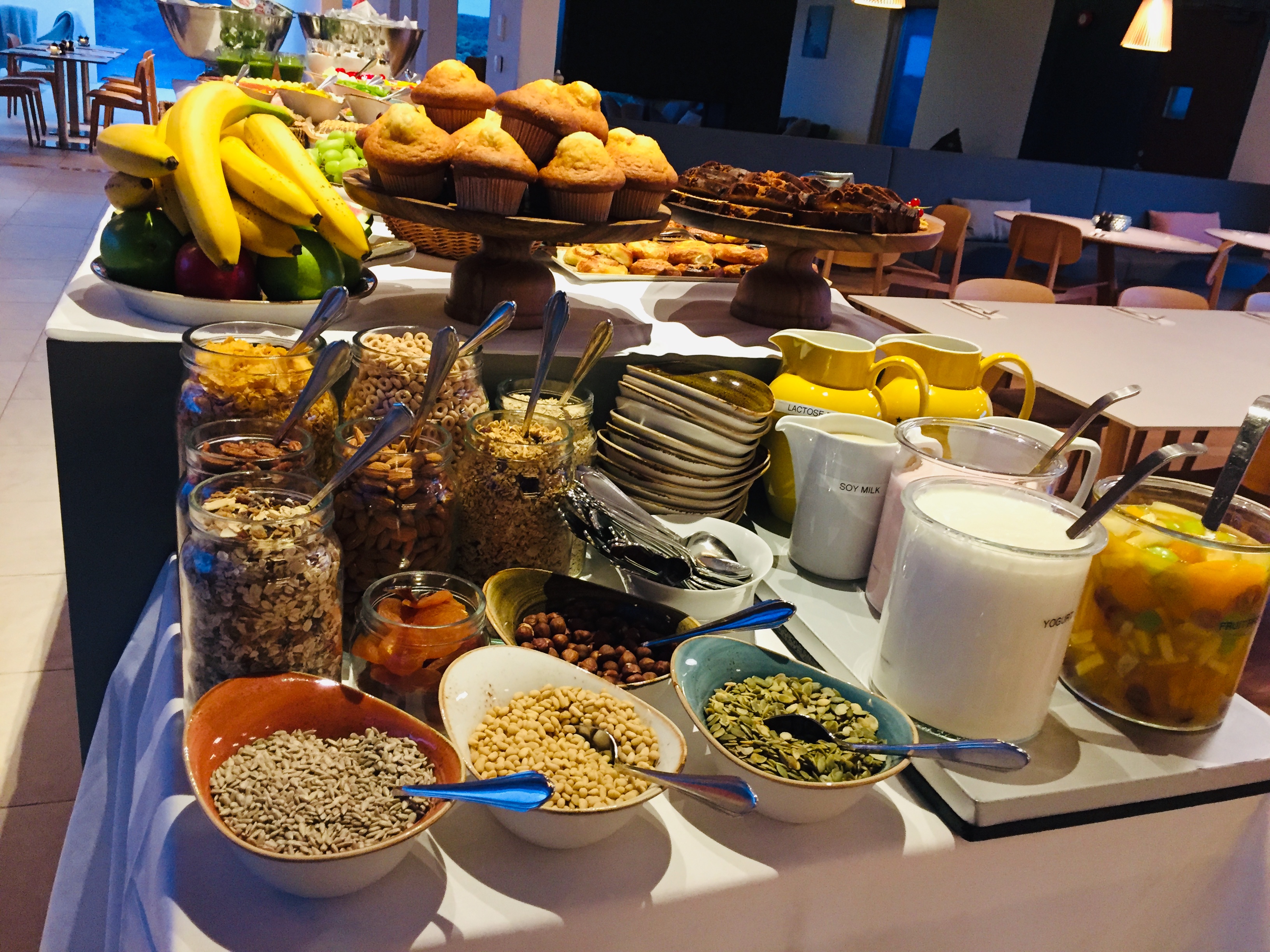 另一邊長桌上的各種穀類、麥片和牛奶與水果。