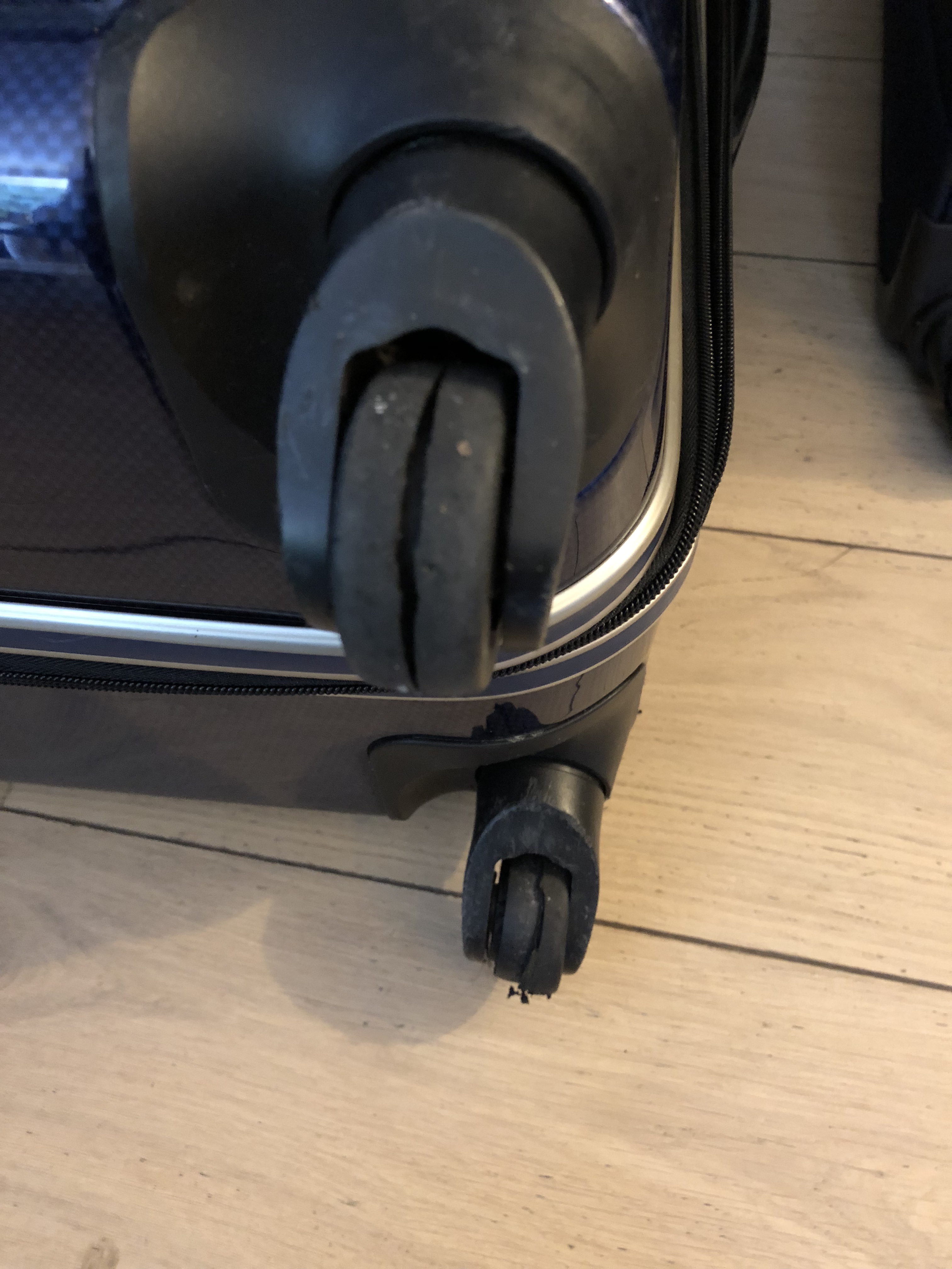 照片看來輪子完全爆掉,原本想說爆一顆還好,沒想到到挪威之後發現已經爆了三顆…為了讓之後的旅程拉行李沒那麼難,只好在當地再買一個行李箱。