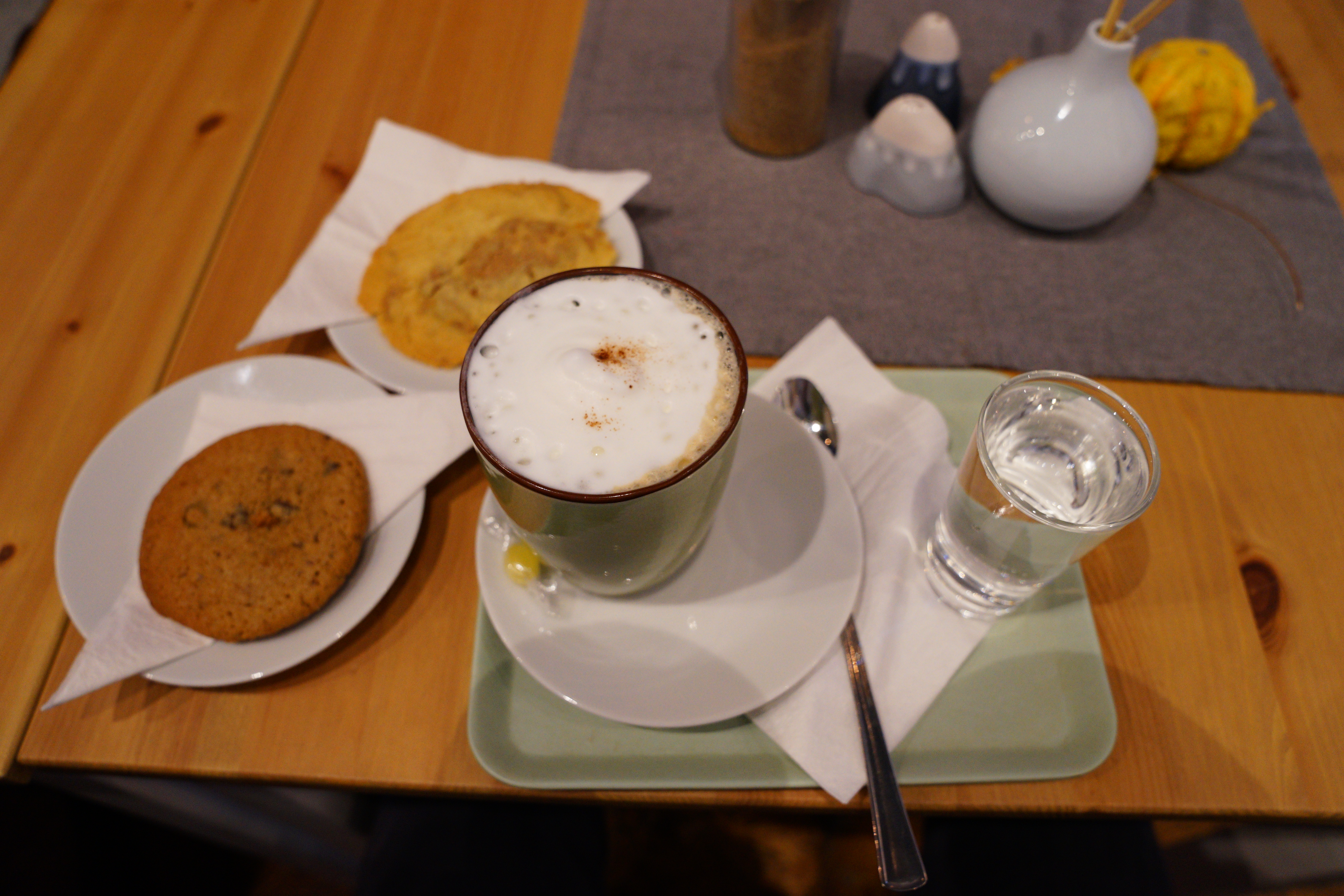 點完餐點送上來了,男伴只點了餅乾和拿鐵。餅乾兩片,一片是肉桂巧克力,另一片是香蕉口味,餅乾是有厚度的那種,口感偏乾,但兩個口味我都不行,吃了一口我就放棄了,拿鐵就…………..就是拿鐵XD。