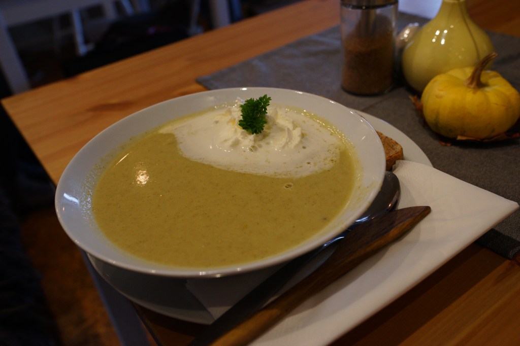 但是……….沒想到湯上來是這種樣子,它是把花椰菜打成泥,然後再加奶油去煮,上面還有鮮奶油,整個湯頭偏鹹就算了,重點是超重的花椰菜味,才喝第一口眉頭就皺了起來,這個我也不行………..挪威的食物真的是太特別了,傳統食物真的不敢恭維呵呵呵