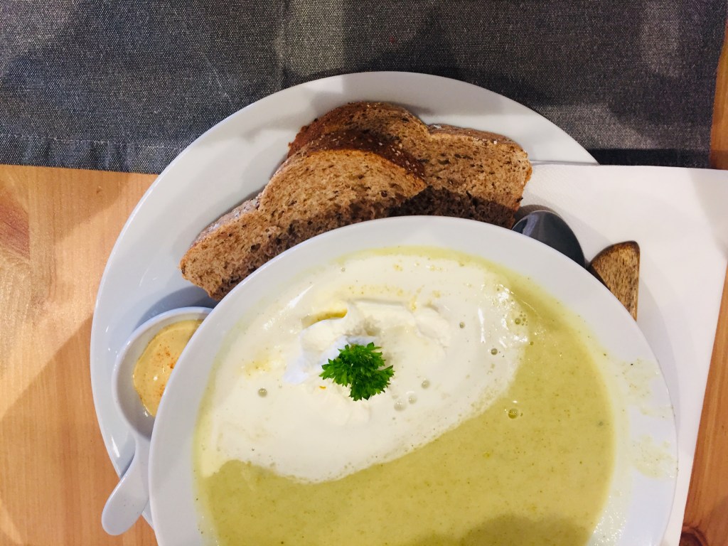 而我這個人就是到哪裡都想要喝湯,沒辦法~~天氣冷就是要來一碗暖胃的食物啊!!於是我點了這碗綠色湯。菜單上面是寫花椰菜湯,我腦海中是一株一株的花椰菜和湯頭,想說應該ok,畢竟我個人雖然說不是很愛吃花椰菜,但還是可以吃。