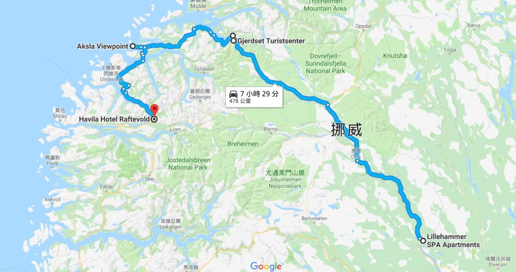 挪威第三、四日行程:翁達爾斯內斯Gjerdset Turistsenter(格耶迪斯圖里斯特森蒂爾度假屋)→ 翁達爾斯內斯半山腰觀景台→Raumavegen商場Spiseriet Soltinn午餐→ 奧勒松觀景台(Aksla viewpoint)→ 拉夫特沃爾德第一飯店 (First Hotel Raftevold)