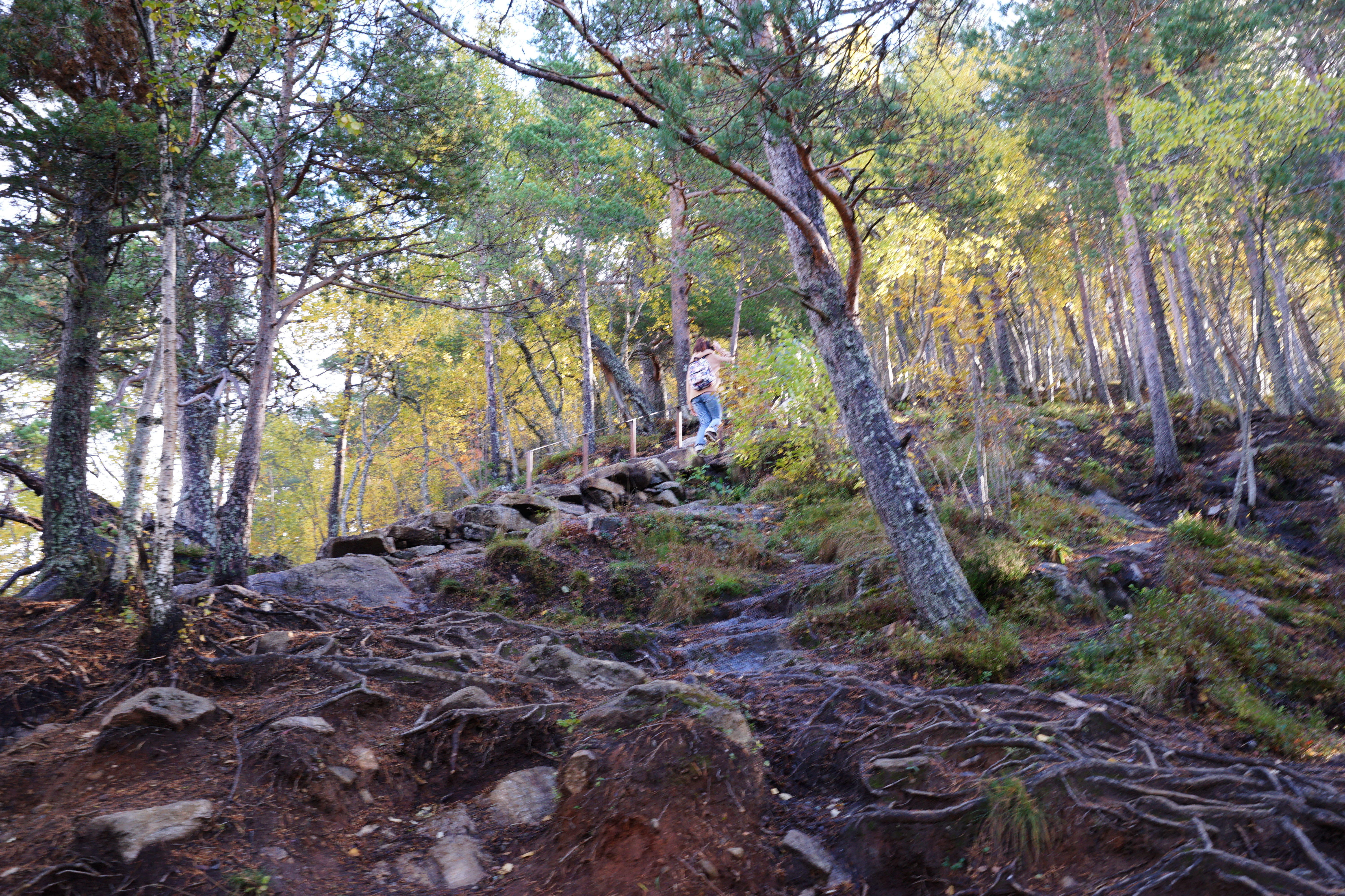 結果往上走變成了這樣…..一路要跟著在樹上的紅色T字標示走,路面變成了光滑的石頭與樹根,要踩著樹根間穩固的地方或是踩石頭走。