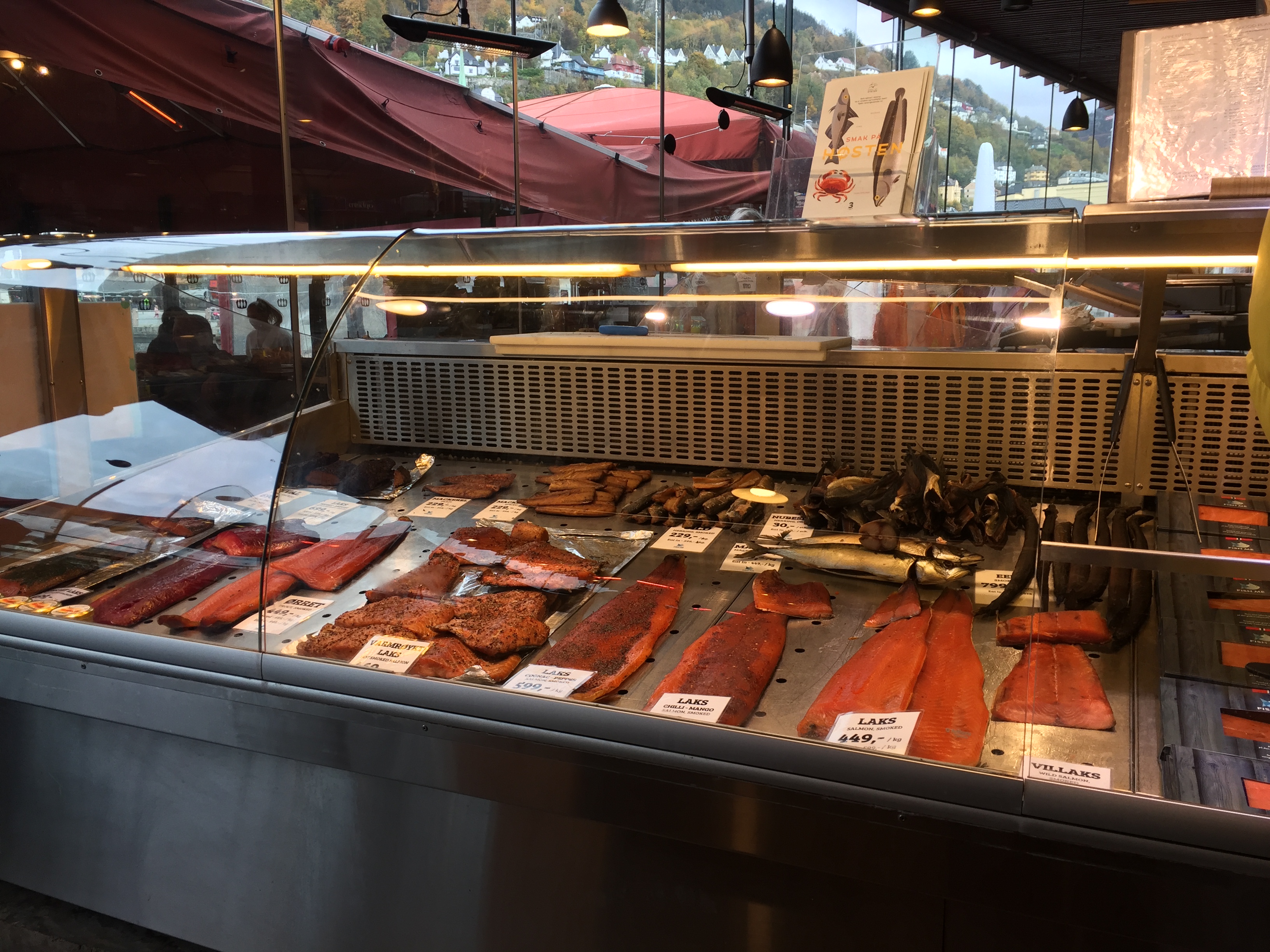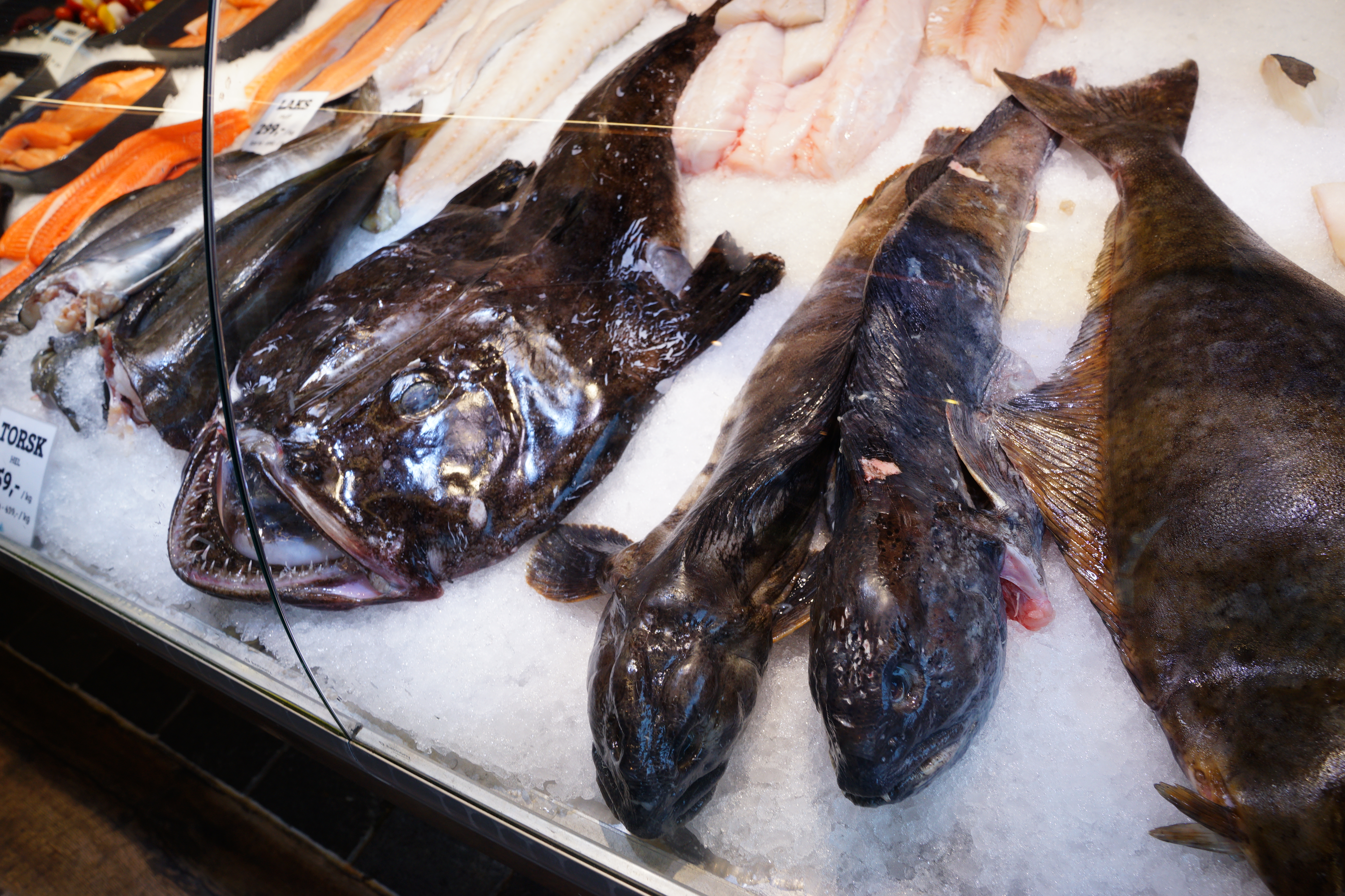 在魚市場裡除了喝魚湯外,還可以看到各種魚類和魚肉,你可以選好某一片魚肉,直接請店家烹煮,在現場直接吃,但內用的價格會比原價高出不少。挪威克朗:台幣=1:3.6,所以看看上面的價格……一片也是要台幣兩千多元挖。