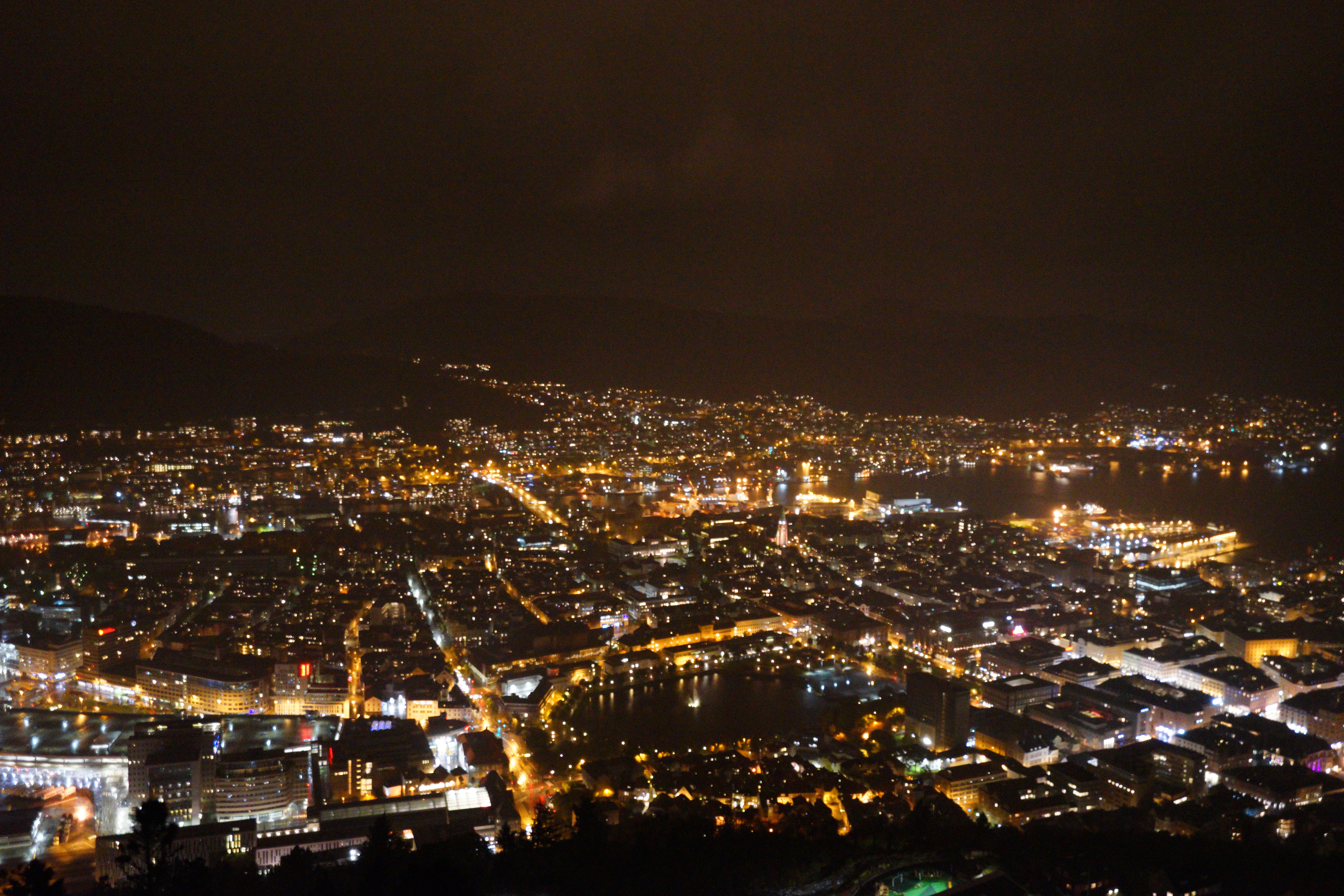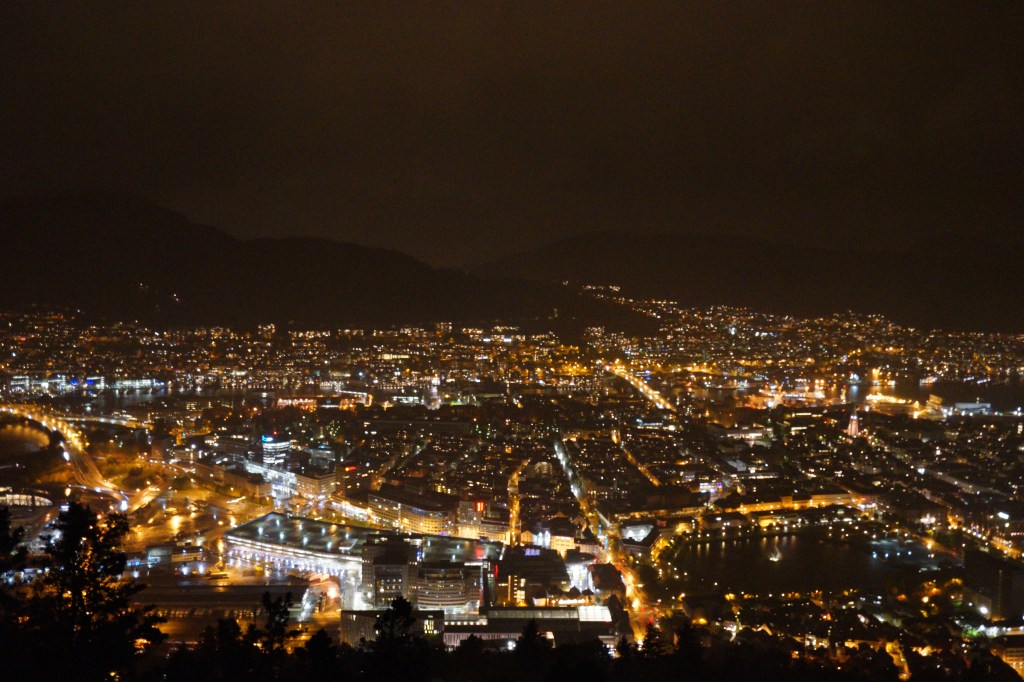 這天抵達卑爾根時天氣雖陰,但沒有下雨,所以當天便和同伴約定於飯店吃完晚餐後再一起去弗洛伊恩山看夜景。沒想到吃完晚餐出來竟然下了大雨,原本還在與同伴討論要不要改隔天,但聽說卑爾根就是個雨都,最後我們決定趁雨比較小一點後就出發。