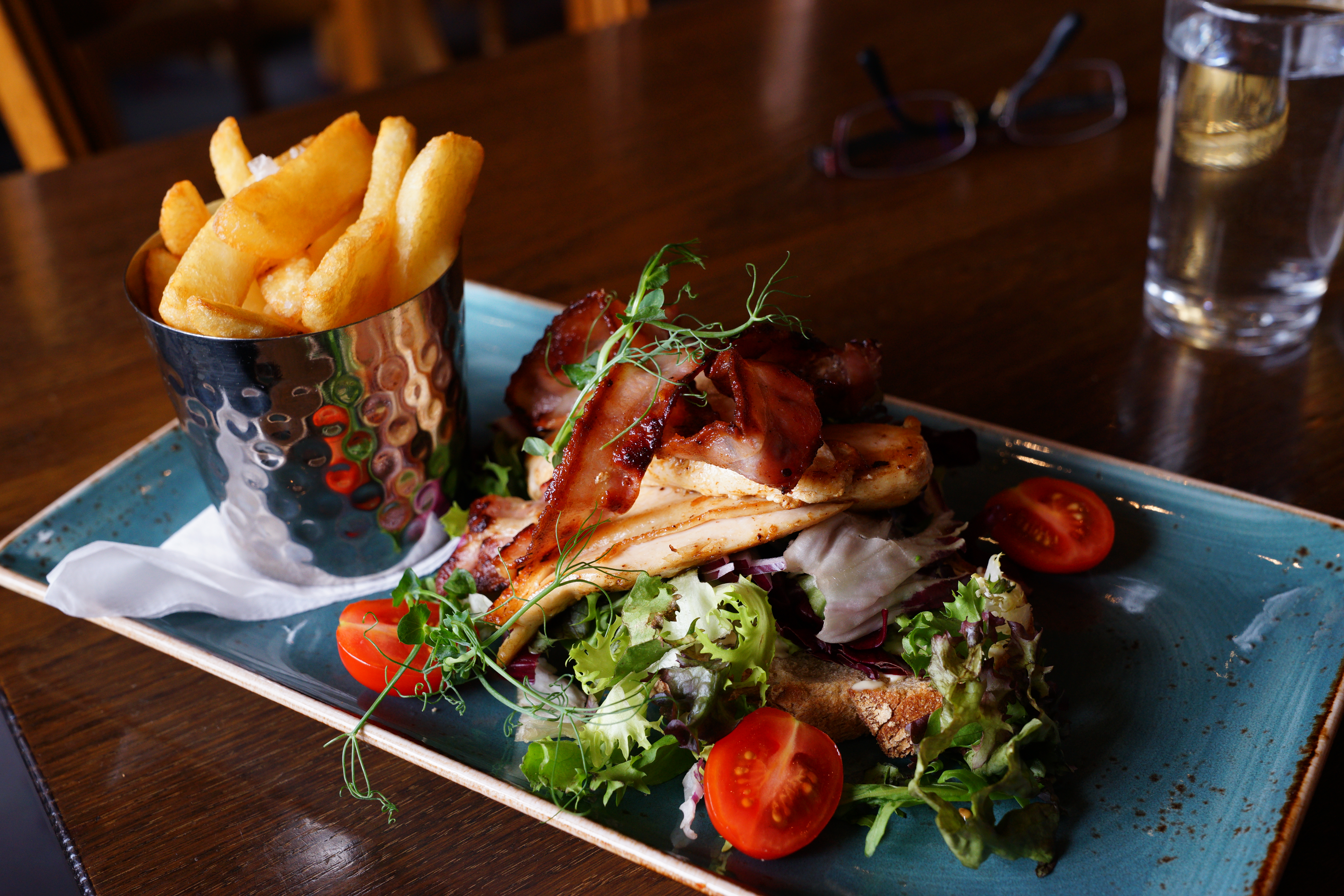 不過不得不說我覺得蠻好吃的,上面的培根煎得很酥脆,雞胸肉稍嫌柴,但煎的口感與醬料搭配很好吃,最底下是吐司墊著,中間有一些生菜,整份的份量算小,以男生的食量來吃的話可能吃不飽。