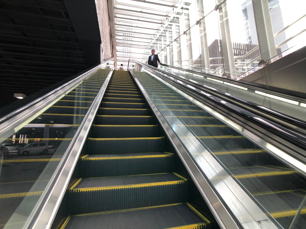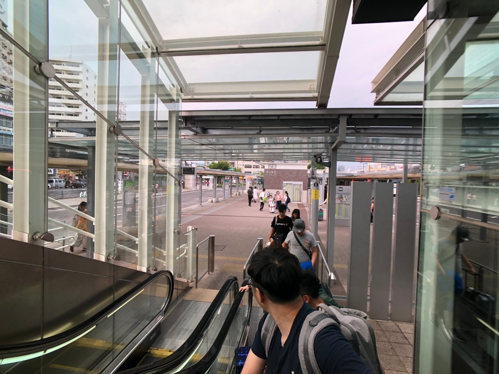 從岡山機場巴士下來後,會看到正前方有向上的手扶梯,要往上走。