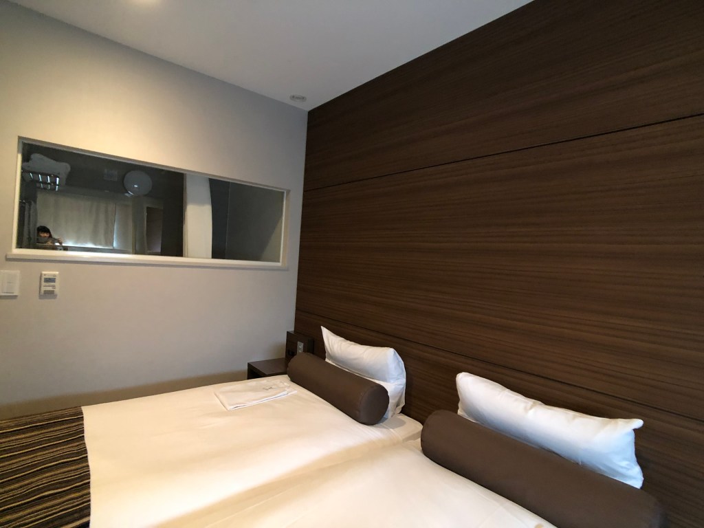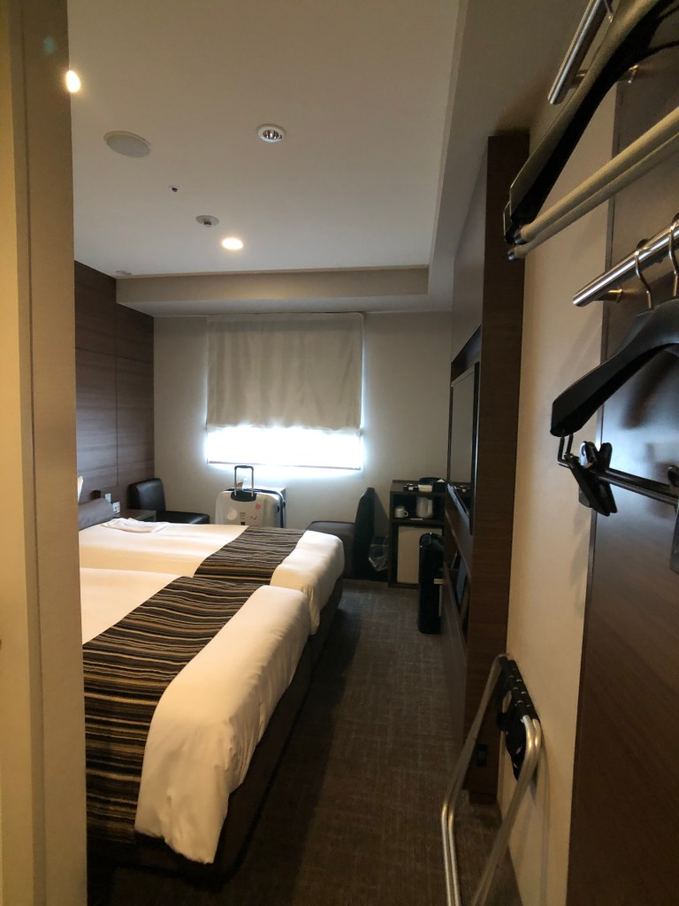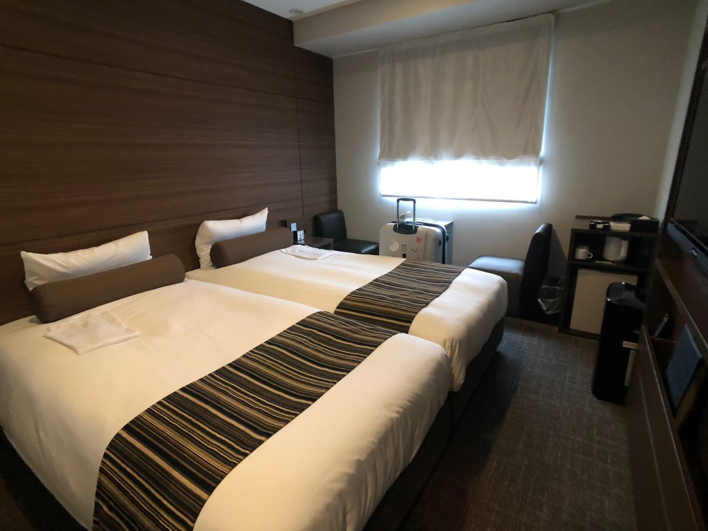 然後記取之前教訓,我這次終於記得拍房間照了哈哈哈哈哈哈哈,這次訂的房型是經濟雙人雙床房,暑假假日一晚房價為12,000日幣,折合台幣大概3,600元左右。