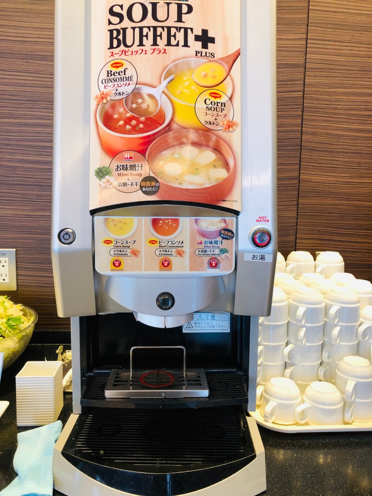 最特別的是這台機器!!!有三種湯能選,按了之後會先從一旁把料倒出來,之後再出熱水,最後就完成了一杯湯,超級酷!!!!! 但如果單純要熱水泡茶的話,要一直按著Hot water的那個按鈕,我本來以為按一下就好,後來怎麼按都沒水,最後工作人員幫我長按裝滿,我才知道要長按。