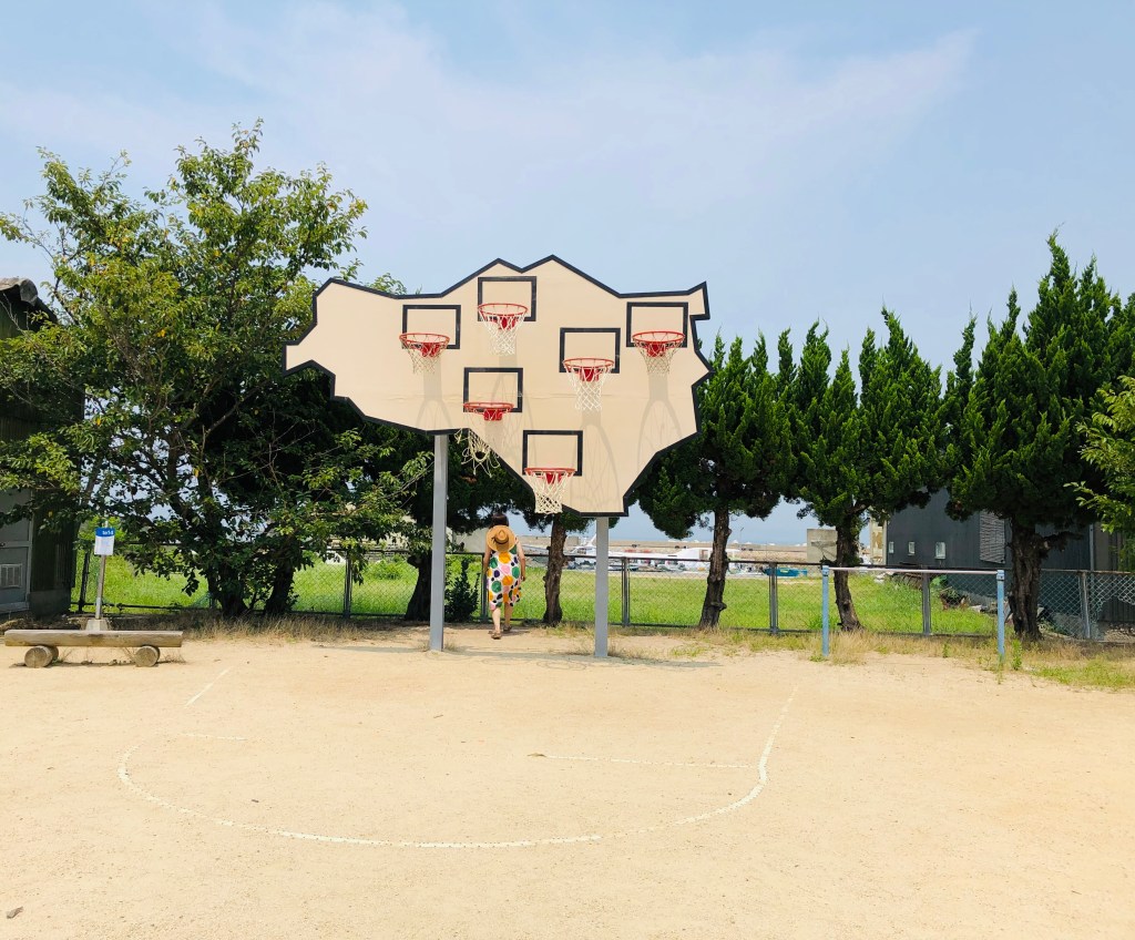 吃飽之後,還有一點時間,想說也把附近的藝術景點看一看,來到很有名的無人勝出─多重籃框,籃球框旁邊有提供籃球讓大家投籃,但真的正中午太熱了,而且也有別的旅客在投球,我們只有拍了到此一遊照就離開了。