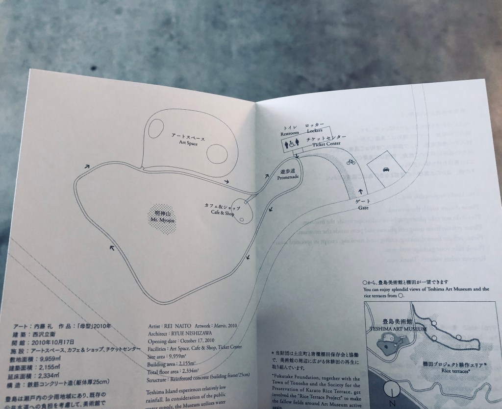 會給予一張地圖,先繞一小段路排隊進入豐島美術館,入館前還要脫鞋,裡面禁止拍照。之前在安排行程的時候,很多人都強烈推薦一定要來這個美術館,原本以為裡面會像一般美術館一樣有很多的藝術品,結果…..