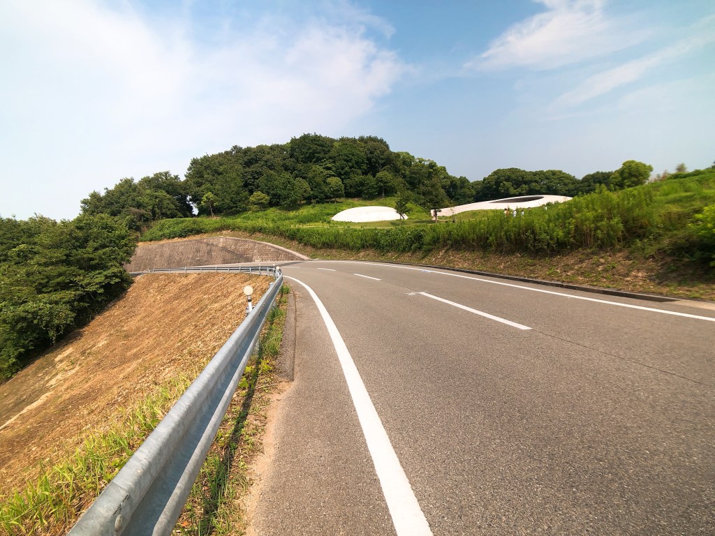 抵達豐島美術館的時間約為11:30,上圖看到白白的建築物就是美術館,抵達後不能直接停車,門口需先領取預約入場券,只有當場次的人才能進去停車,我們拿到的入場時間為13:15,15分鐘一個場次,所以與友人商量後決定繼續往下騎先吃午餐。