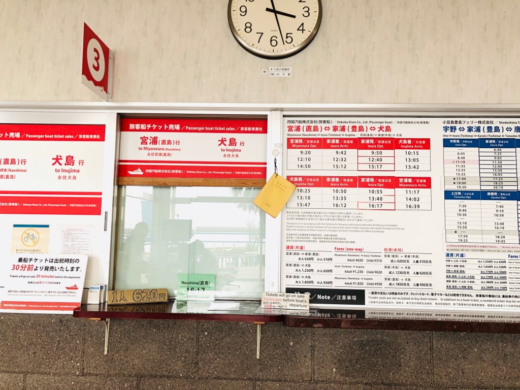 從家浦港回宇野駅需在2號櫃檯等待,一開始要先排隊等開櫃,工作人員會發放號碼牌,之後開櫃之後才能購票。