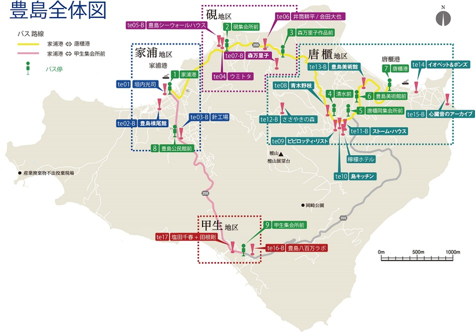 豐島地區有兩個港口-家浦港與唐櫃港,分成四個區塊-家浦地區、硯地區、唐櫃地區與甲生地區,大部分的景點都在豐島的上半部,從家浦到唐櫃的距離大約為4KM,繞一整圈豐島大概為8KM。
