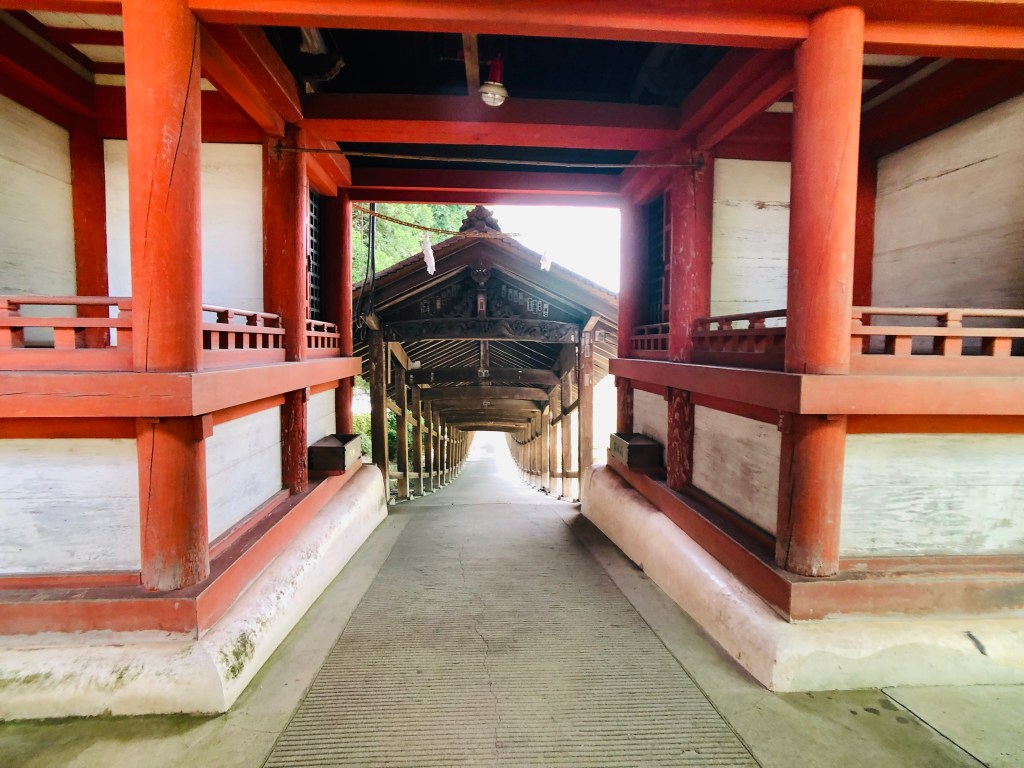 神社往右走會看到這裡著名的木造迴廊,相傳建造於1579年,全長360公尺, 迴廊到底是鳴斧神事的儀式進行處─『御釜殿』,是祭拜「溫羅」的地方。