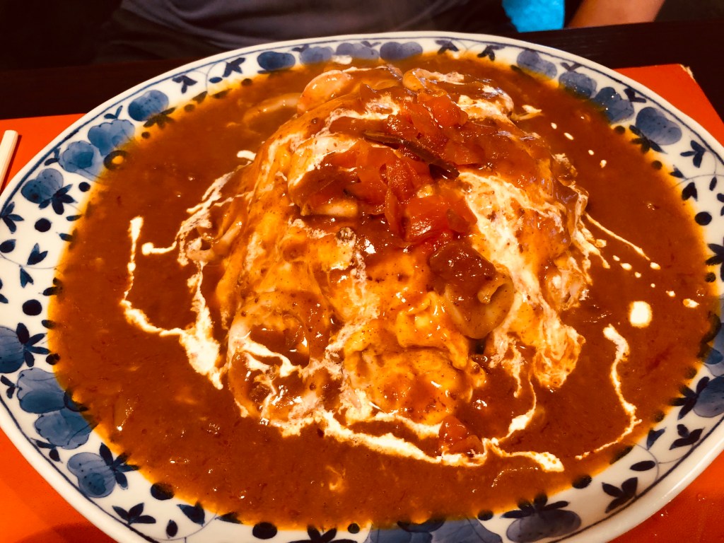 男伴點了海鮮咖哩蛋包飯,裡面真的是滿滿的海鮮,蝦子、魷魚、蛤蠣等等,這個的醬汁番茄味比較重一點,醬汁的辣度也低於牛肉咖哩,蛋皮很薄,包覆在白飯上面,挖一口可以吃到各種食材,口感層次蠻鮮明的,而且份量算是一個男生吃也能吃飽的那種份量,很推薦。