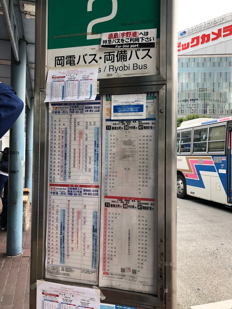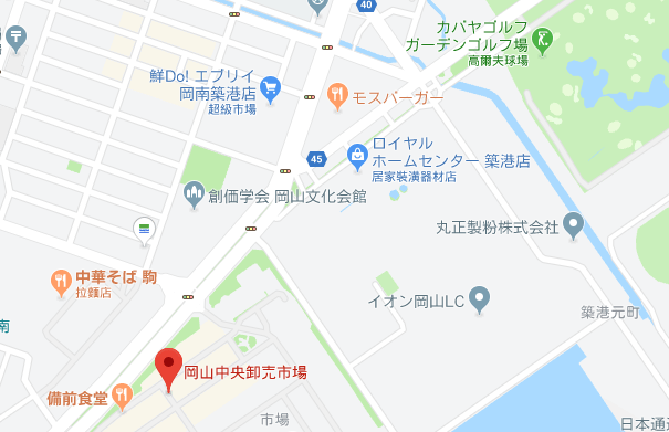 從岡山駅到中央卸売市場要去岡山駅前的巴士站搭乘巴士前往,只要是有到築港元町站的公車都可以搭乘,單趟車資400日圓,可刷各類交通卡,大概半小時可以到達。