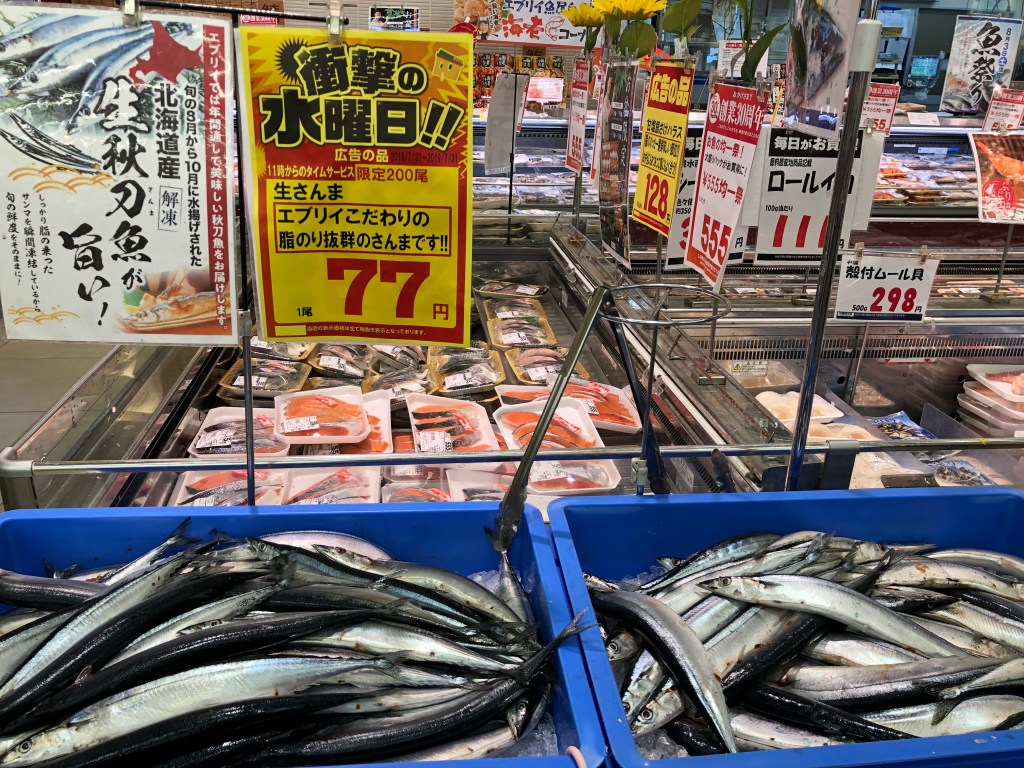 下車後我們有先進去超級市場補給一下,剛好看到秋刀魚一條才77日幣!!!!這也太便宜了吧!!!!