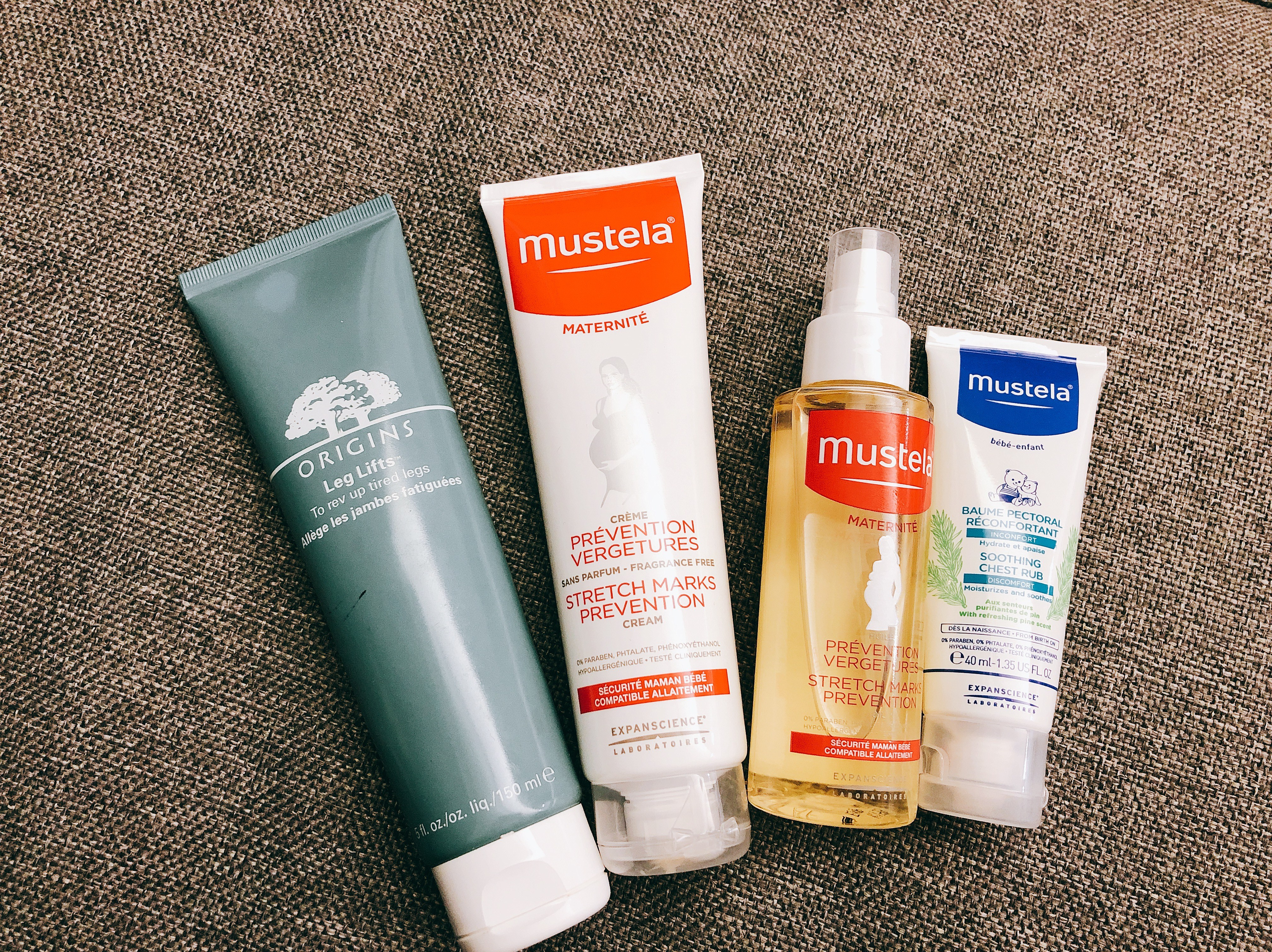 這是我的用品清單,基本上洗完澡後就會擦一下,由左而右依序為品木宣言漫步雲端腿部舒緩霜、慕之恬廊孕膚霜、孕敷油和康撫膏(脹氣膏)。