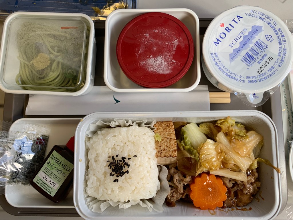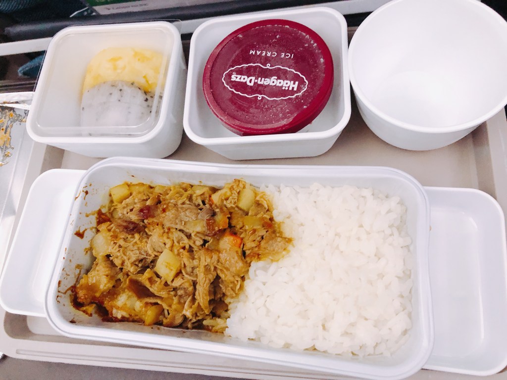 上圖是回程的時候的餐點,我選了牛肉飯,但回程的牛肉吃起來是壽喜燒的感覺,味道偏甜量很多,最後我只有把飯和配菜吃完而已,左上是涼麵,口感還蠻Q的,不過沒有很餓也就沒吃完,回程也有哈根達斯覺得開心。