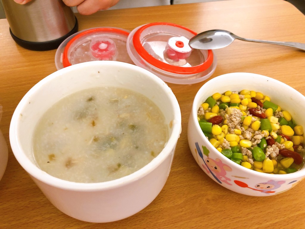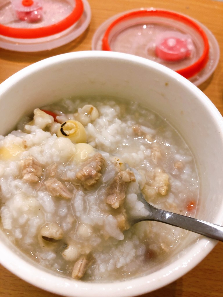 早餐的部分基本上是粥,用料蠻多的一大碗,其他的配菜蠻多元的,後來其實胃口有變小了,這樣一餐的份量可以餵飽2~3人,別看小小一碗,其實很多XD