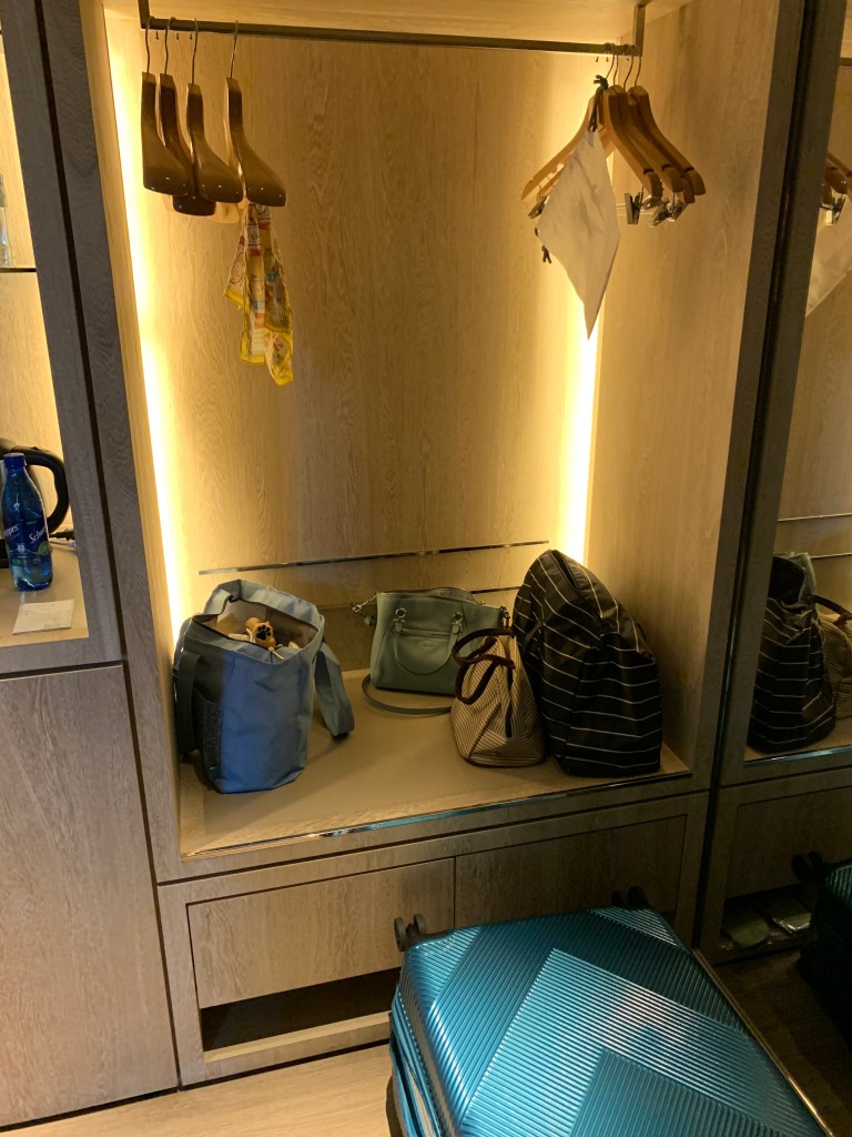 門的正對面就是一個衣櫃。提供的衣架數量很足,而且衣架上有夾子,我們一到就先把寶包的東西夾上去了😂
