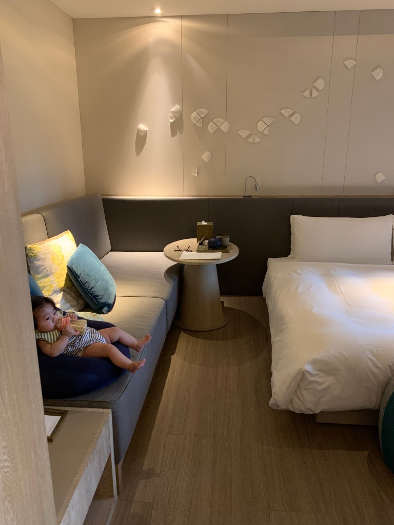 我們這次訂的是飯店房型最便宜的雅緻客房,但其實房間也不小,床旁邊的沙發椅就足夠躺一個大人,寶包在上面爬來爬去也很可以👍