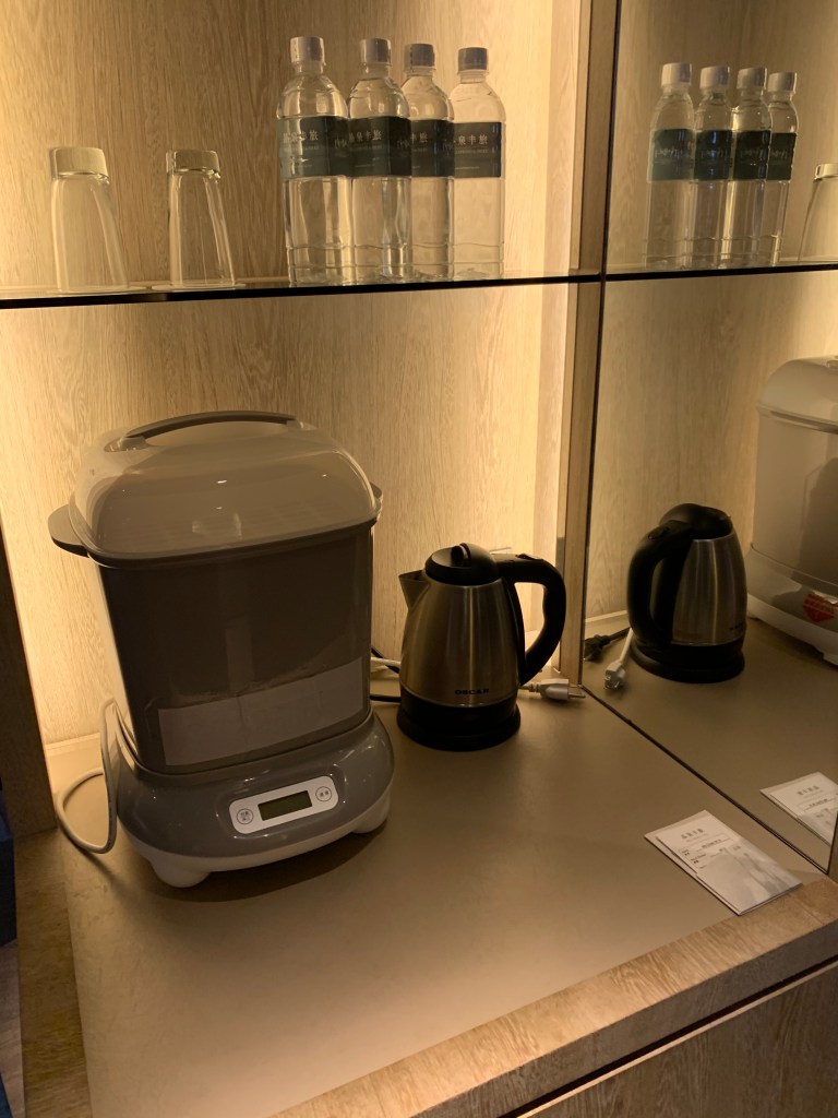 飯店提供Combi的消毒鍋,剛好跟家裡用的是一樣的。上面的飲用水如果用完還可以跟飯店索取。有熱水壺可以煮水。