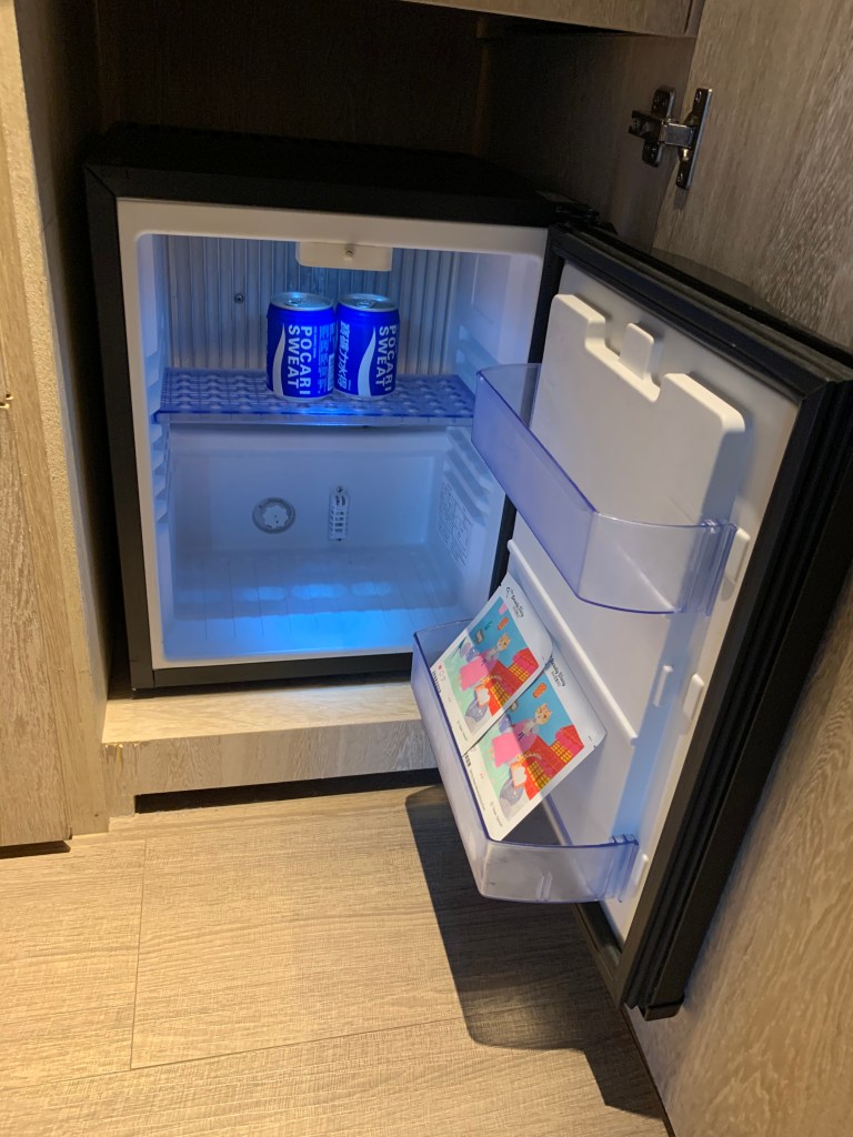 下方有冰箱,裡面有兩罐寶礦力水得和面膜,都可以免費使用。