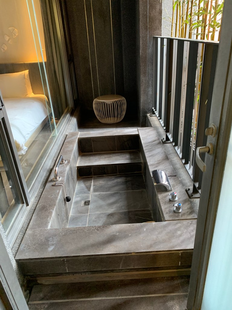 床旁邊就是半露天溫泉池了。當初選這間飯店的其中一個原因也是因為有半露天的溫泉池,覺得這樣比較有情調😂😂雖然半露天,但外面看不太進來,若是有疑慮的話兩側也有簾子可以拉下來,保證看不到!