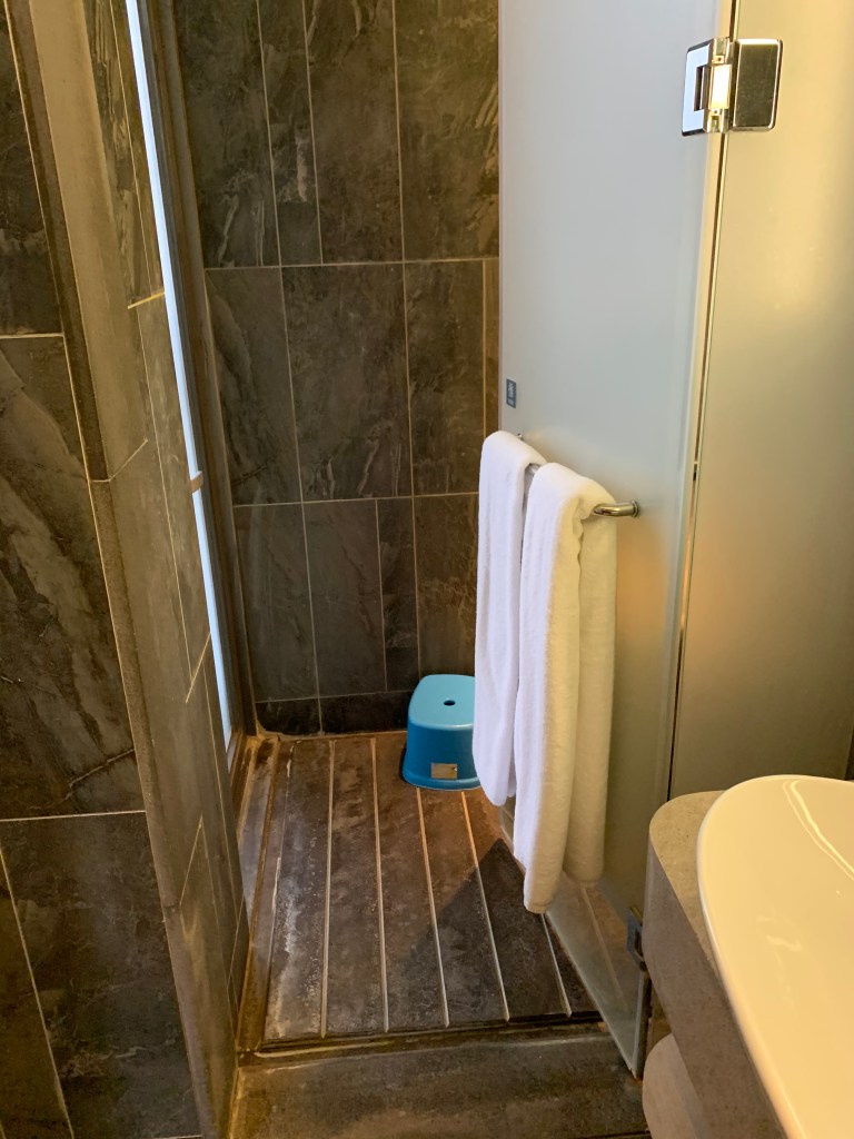 浴室的部分比較小一點,但就是讓人稍微沖洗一下,另一邊連至溫泉浴池,整體的規畫其實還不錯。
