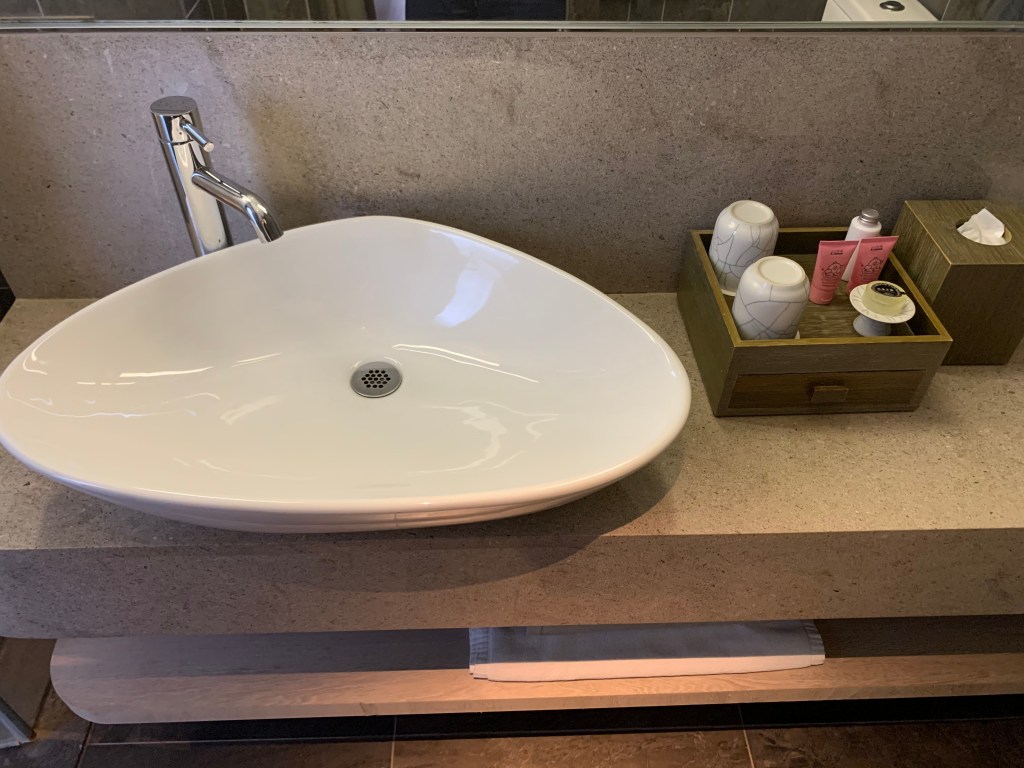 洗臉檯上的備品很簡潔乾淨,漱口杯的造型很美!其他的牙刷備品都放在下面的抽屜裡,這樣的安排讓整個廁所給人的感受很整齊。嬰兒的沐浴用品提供上山採藥的洗髮精和沐浴乳,沒使用完帶走之後出去還可以使用,覺得貼心❤️
