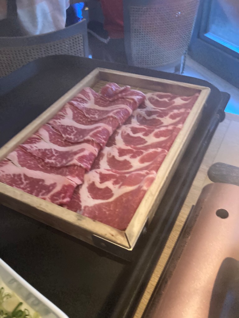 然後還有一大盤肉~肉~我們選一半豬、一半牛,如果照著服務人員建議的時間煮的話應該很好吃,可惜寶包不乖,爸爸媽媽來不及顧肉阿阿阿阿阿阿阿