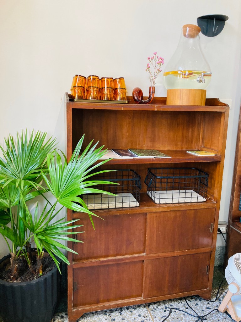 裡面的空間不大,因為都坐滿了人我就沒有拍一樓了。一進門就有個自助裝水區,舊舊的櫃子配上磨石子地板,有種阿嬤家的感覺。