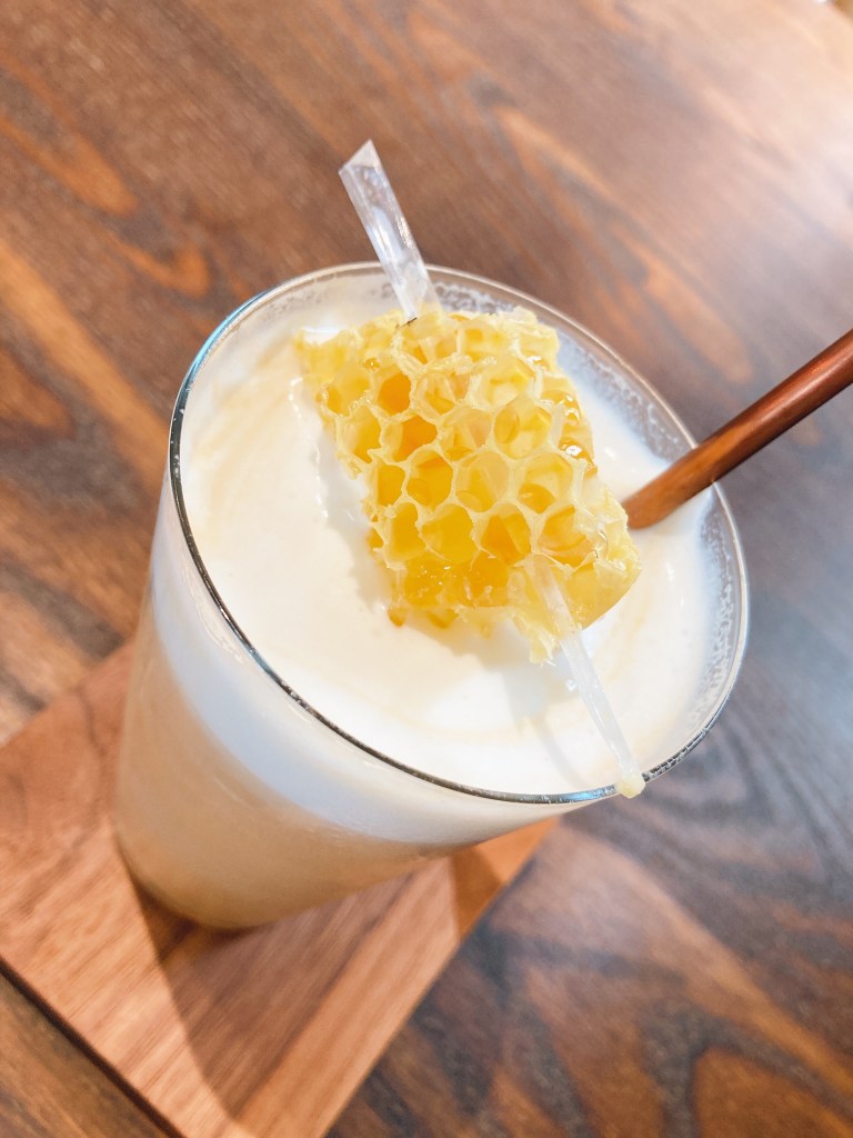 上面是一塊蜂巢,我真的是第一次嚐試!!!!本來以為會甜甜的,但味如嚼蠟哈哈哈哈哈哈哈,就真的是吃蜂蠟的感覺,蠻有嚼勁的,只能說蠻特別的口感。
