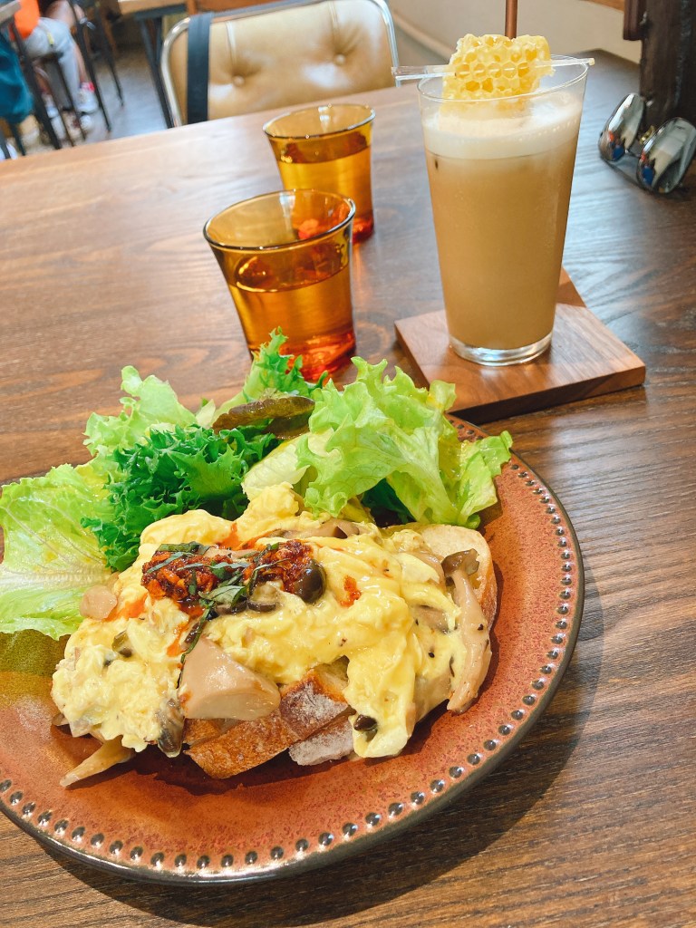 是野菇炒蛋+烤麵包還有一些綠沙拉。