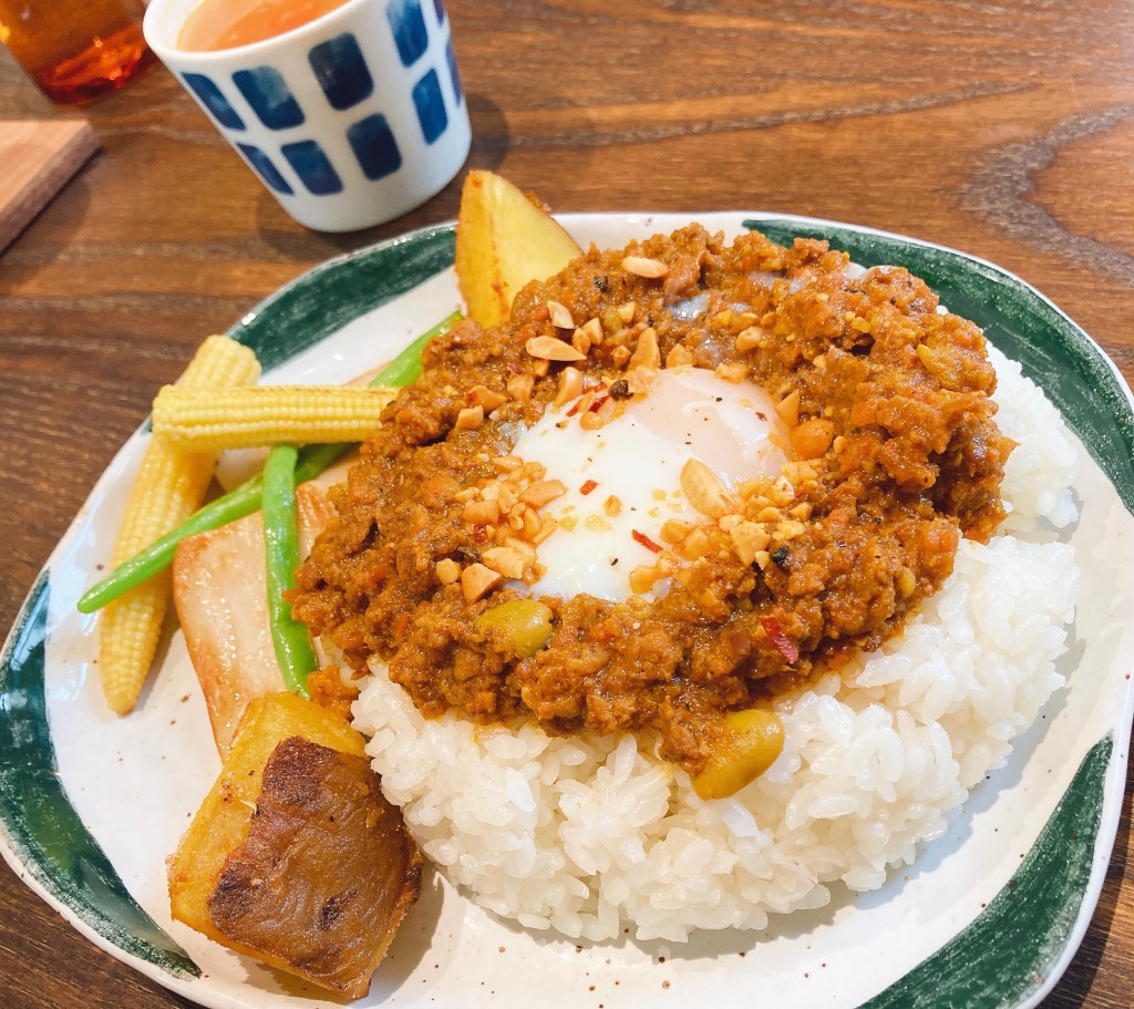 上面有一顆水波蛋,一旁有一些蔬菜陪襯,肉末咖哩微微辣,白飯的Q度很足,有點像是日本米飯的那種口感。