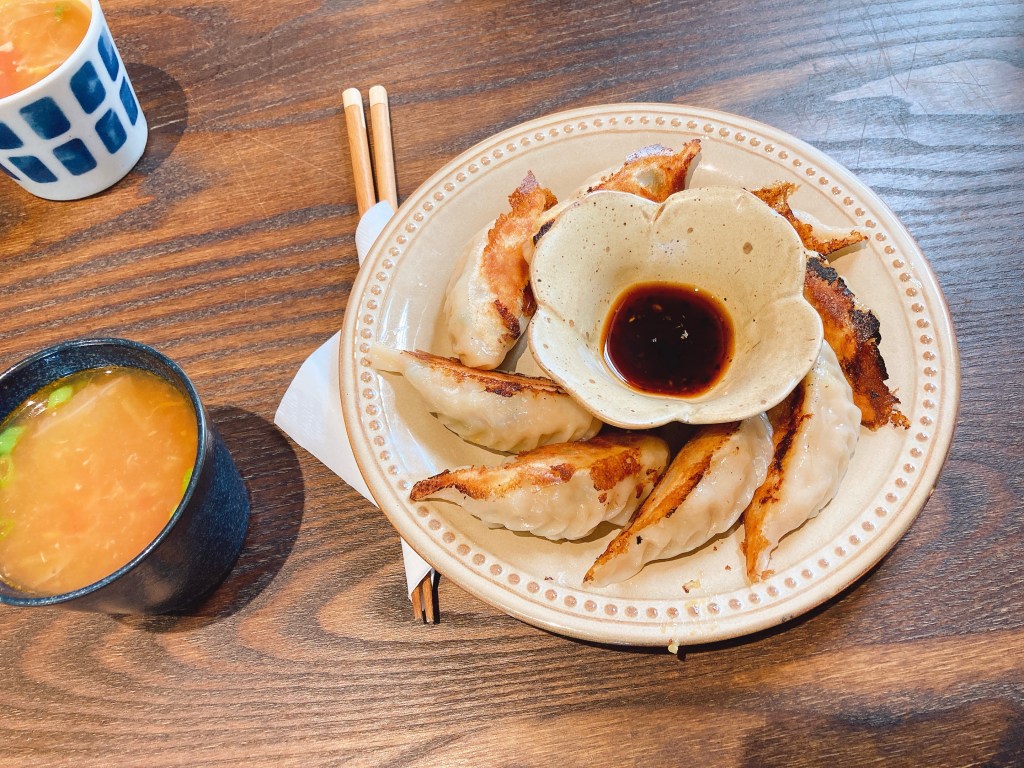 每一顆煎餃底部都被煎得焦焦的,咬下去有卡ㄘ的聲音,因為裡面包的是雞肉,所以吃起來不會覺得油膩,同樣搭配一碗番茄蔬菜湯,簡單清爽無負擔的感覺。