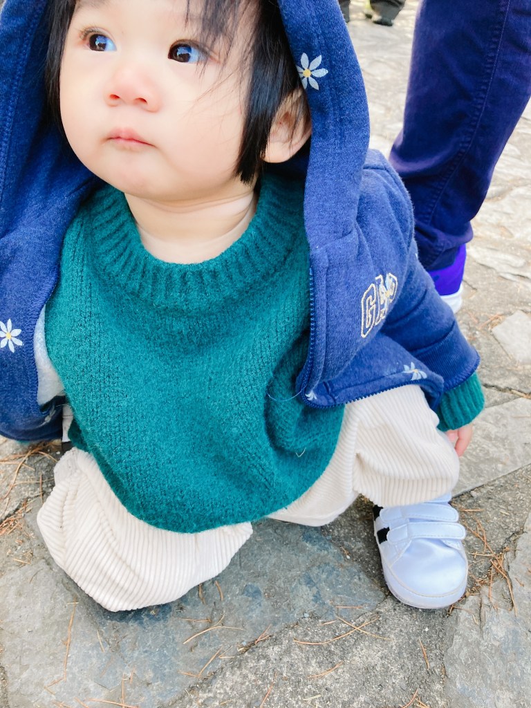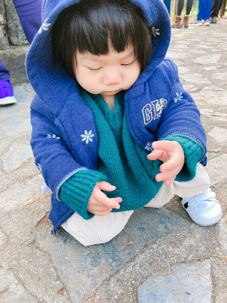 原本還有幫寶寶帶針織毛帽,可是最後被她拔掉,如果寶寶不排斥帶帽子的話建議要帶,要不然就是外套有帽子也可以。13度的氣溫大概也是採取洋蔥式穿法,薄外套+毛衣+短袖+有點厚度的褲子+襪子,畢竟如果要待在那裏一大段時間的話,太陽出來變熱還是可以脫掉。