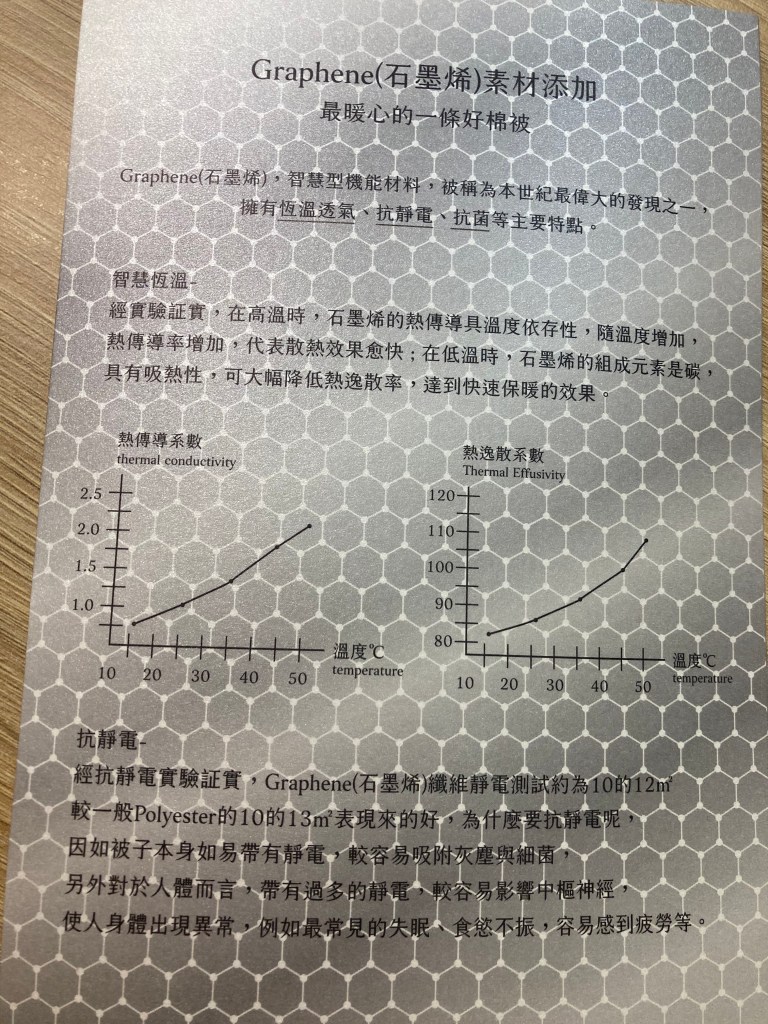 石墨烯算是一種奈米材料,由於它的原子結構穩定,因此不容易受外界影響。若把它用在棉被裡,則能有很好的熱傳導性,在高溫時,隨著溫度增加,熱傳導率也會增加,散熱效果就越快;在低溫時,則具有吸熱性,可以大幅降低熱的逸散率,達到快速保暖的效果。