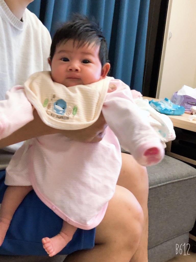 剛出生的嬰兒軟軟的,所以基本上都不會做套頭的款式,在醫院或是月中護理師會幫寶貝準備開襟的紗布衣,算是只有半身的那種,在胸口處會做綁帶的設計可以綁。因為剛出生的嬰兒每天的工作就是吃、睡、拉,一天尿布至少要換8~10片(甚至更多),這種衣服就比較好換尿布,換尿布的時候不需要顧慮到衣服是不是有拉好,洗屁股的時候也比較方便。但單穿這個外,通常寶寶外面會包一層包巾,除了避免著涼外,也是把寶寶包緊緊他會比較安心。