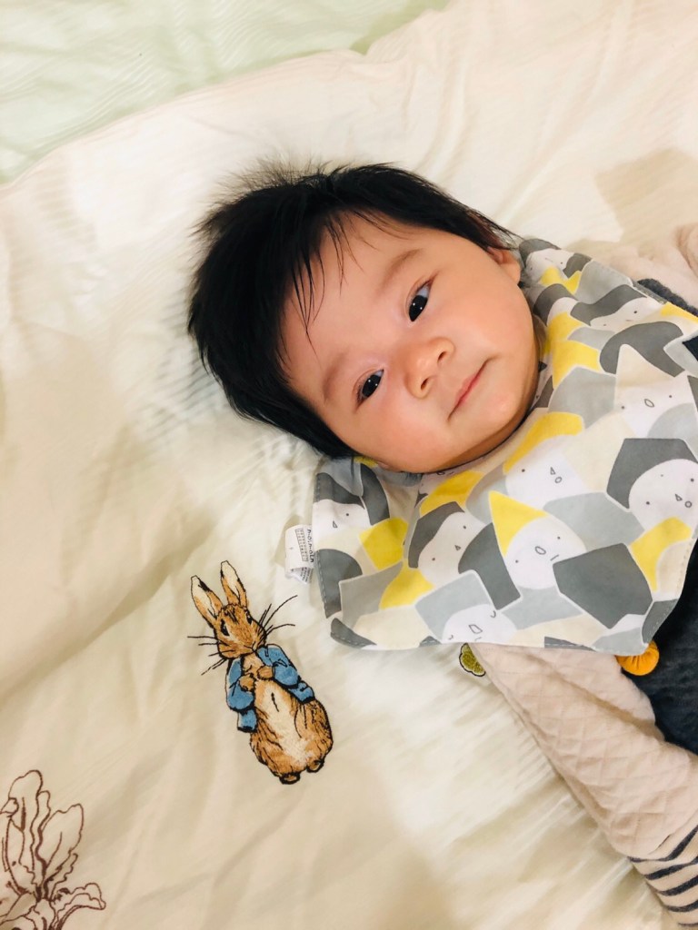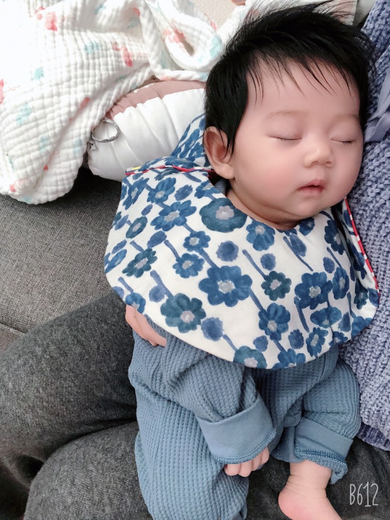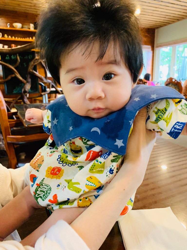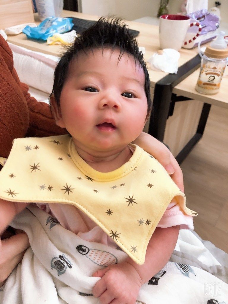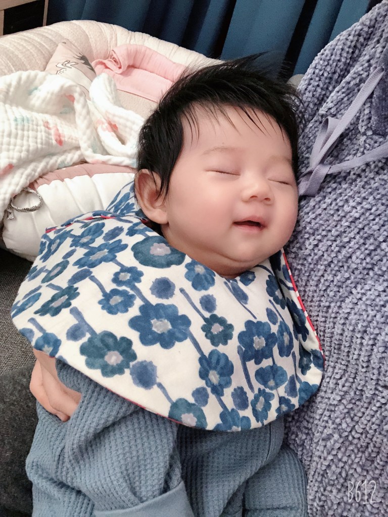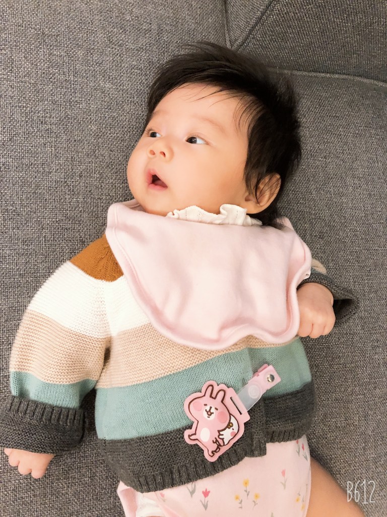 另外就是口水巾有很多種款式,我覺得單一片布的比較好用,不要有蕾絲或是其他奇怪的裝飾品,因為口水巾除了吸口水之外,也會有奶漬,或是4個月之後吃副食品的污漬,那個部分就會變得非常難洗,增加媽媽洗衣服的時間。然後我不推薦領巾型口水巾,雖然好看,但吃東西很容易卡到嘴巴,下擺尖尖的相對能吸到的空間也比圓型的少。
