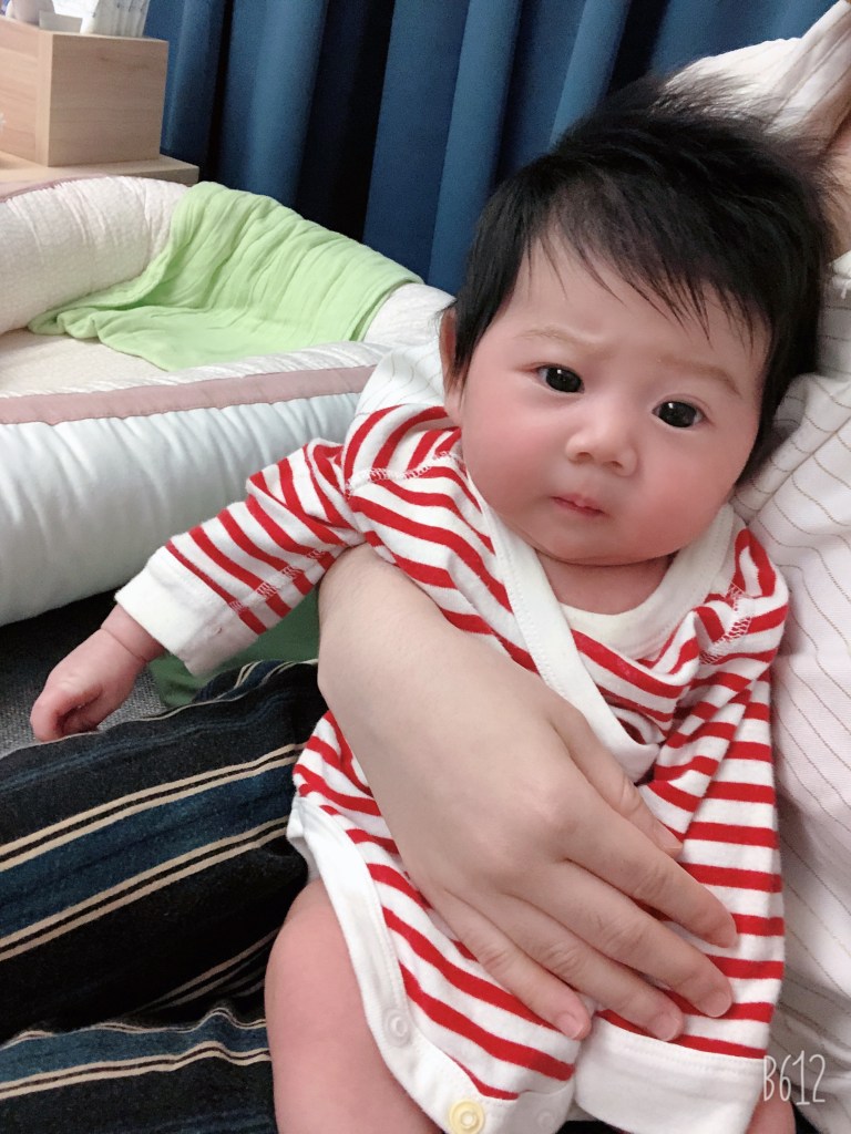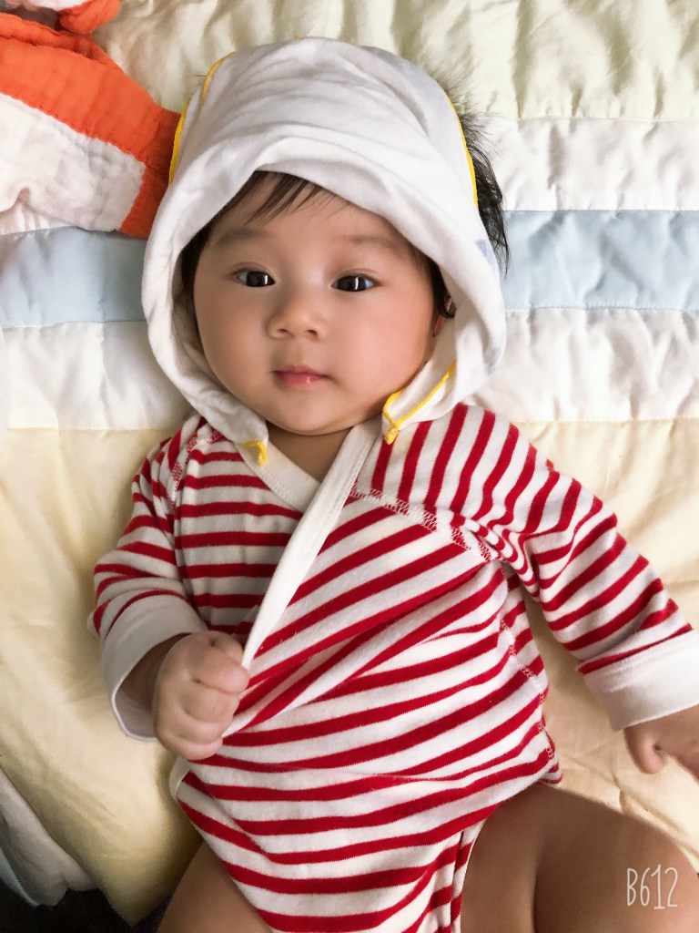中、右的照片則是蝴蝶衣,顧名思義就是像蝴蝶一樣,比起開襟的紗布衣長,可以包一點腿,但在腿部只設計幾顆扣子讓大人可以稍微扣起來,這種衣服也方便穿脫,有時候不小心吐奶還是大便溢出來換洗就很方便。Uniqlo就可以買到蝴蝶衣了。