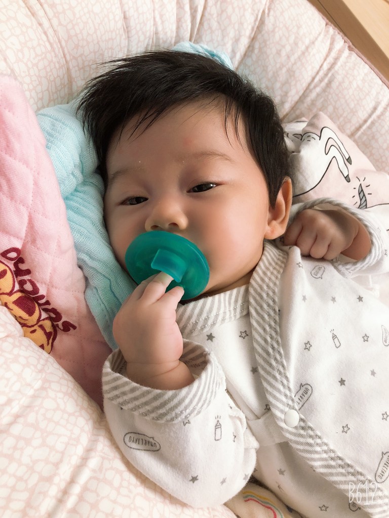 我覺得奶嘴要看寶寶喜不喜歡,一開始在月中的時候因為寶寶很容易哭,後來護理師建議給寶寶吸奶嘴,後來就都有吃奶嘴了,不過只有睡覺的時候才會讓她吃。現在YUI平常也不會吃奶嘴,睡覺的時候才會自己拿奶嘴來吃。有時候睡一睡醒來有摸到奶嘴吃哼個兩下就可以又睡去。我是只有準備一個奶嘴,有時候如果忘記帶就很麻煩,小孩會很歡,如果平常都在家就還好,如果常出門的話建議可以多準備1~2個。(奶嘴上掛的安撫娃娃下次會分享)